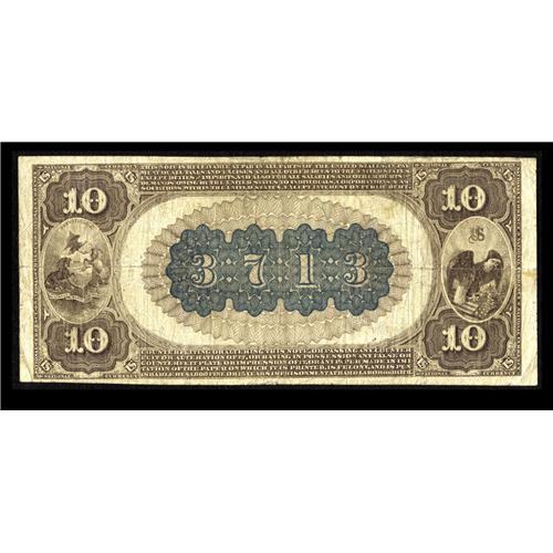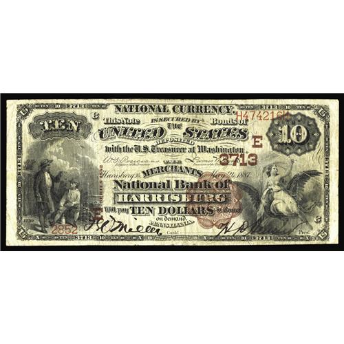 <B>Harrisburg, PA</B></I> - $10 1882 Brown Back Fr. 483 <B>The Merchants NB</B></I> Ch. # (E)3713<BR>The penned signatures are dark and were executed with great care. This $10 has retained nice color for a mid-grade note, with this one of only three early notes extant from this state capital bank. <B>Fine.</B></I>