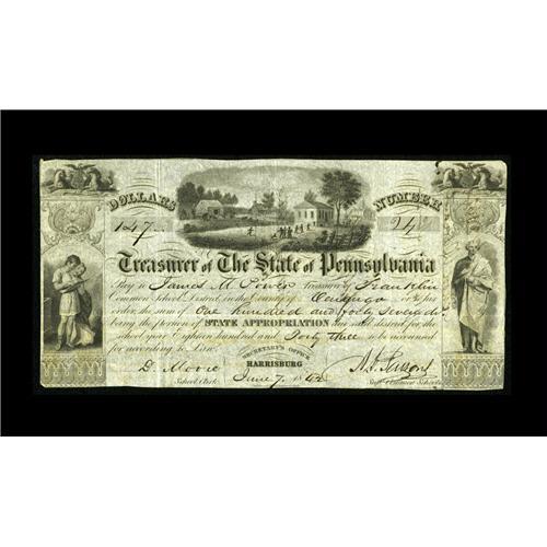 <B>Harrisburg, PA- State of Pennsylvania Appropriation Certificate</B></I> $147.00 June 7, 1842<BR>A certificate from the Treasurer of the State of Pennsylvania appropriating money for the Franklin School District in Venango County. <B>Very Fine.</B></I>