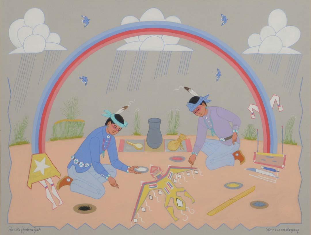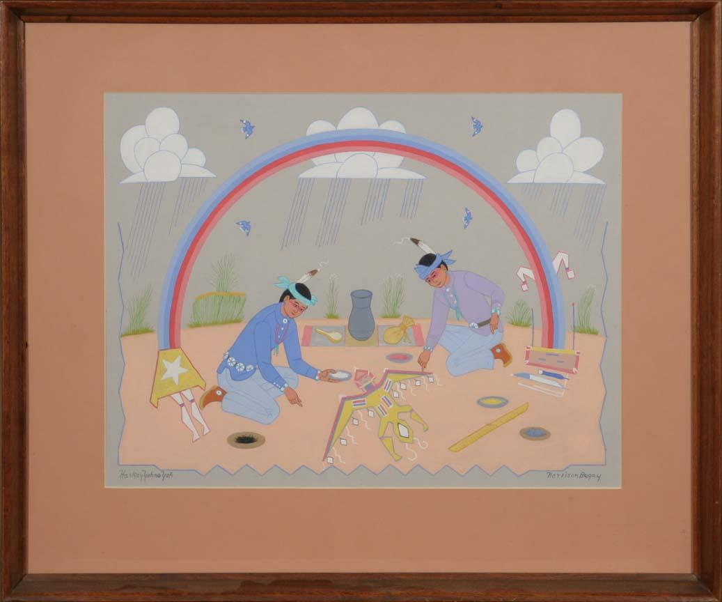 Harrison Begay (b.1914). Navajo Sandpainters. 14" x 18 gouache . Signed lower right. (est $1,000-2,000). For condition reports please visit: www.auctioninsantafe.com/cr2011.pdf