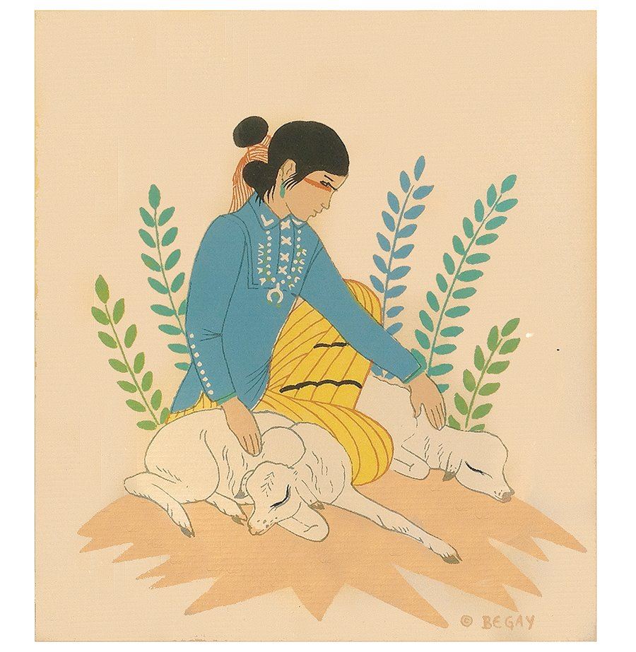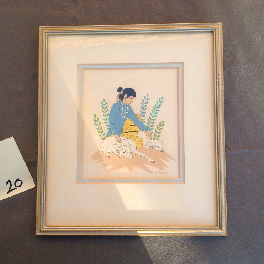 Early silkscreen print showing a girl in a blue blouse with her lamb. Good condition.,,Frame 1" x 10", Art size 6" x 7"