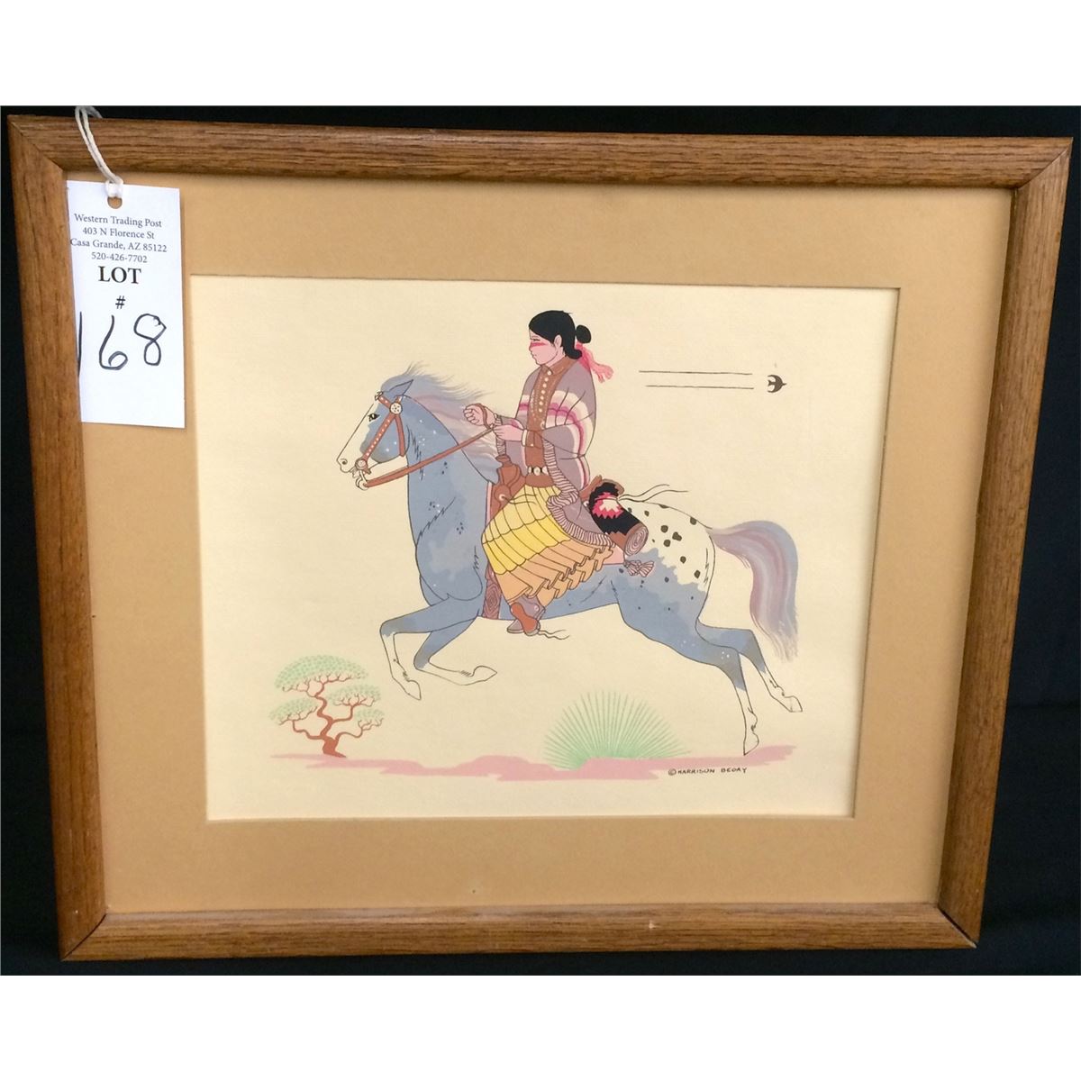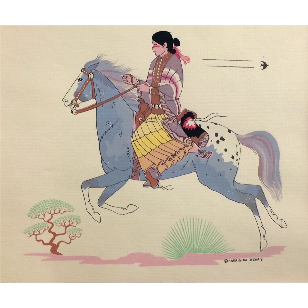 This framed Harrison Begay Silk screen print measures 17" x 15". Information is attached to the reverse telling about the artwork and artist.