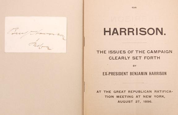 Harrison, Benjamin (1833-1901) 23rd President of the United States (1889-1893). Signature ("Benj Harrison") on 2 x 3¼" paper affixed to inside of 8 x 5¾" paper covers, bound with a red ribbon, holding a 16-page pamphlet of a speech titled "Harrison. The Issues of the Campaign Clearly Set Forth by Ex-President Banjamin Harrison At the Great Republican Ratification Meeting at New York, August 27, 1896." Lightly toned, else fine. Housed in a reddish-brown case.