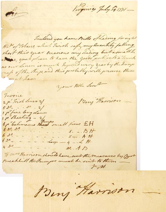 Harrison, Benjamin (1726-1791) American Revolutionary leader; member of the Continental Congress (1774-1778); Signer of the Declaration of Independence; Governor of Virginia. He was also the father of William Henry Harrison, the 9th U.S. President, and grandfather of Benjamin Harrison, the 23rd U.S. President. Autograph Letter Signed, "Benj Harrison" and initialed "BH", 1½ pp plus separated address leaf, 9¼ x 7¼ in., Virginia, July 19, 1771. Addressed in Harrison`s hand to "Mr. John Beckhouse, mercht in Liverpool" and sent by ship with Capt Breakhill, ordering goods from England. In part: "Inclosed you have Bills of Lading for eight H[og]h[ea]ds of Tobacco, which I wish safe…my Quantity falling short this year…please to have the goods put into a Trunk as our Linen is much Injured every year by the Dampness of the Ship, and this probably will preserve them…." He pens a list of items wanted, including Irish linen, sheeting, and 28 pair of "Calimanes Pumps" in various sizes, with intitials beside each one, probably referring to his children. He adds a note, "If Mrs. Harrison should have sent the measures by Capt. Breakhill the Pumps must be sent to them" and signs with his initials, "BH."A note on the verso, dated Jan. 31, 1797 and signed by Henry Gardner, states that this paper was exhibited before him and three commissioners, who also signed, probably having to do with the probate of Harrison`s estate. Very good; overall toning and horizontal fold almost split through; some edge chipping and paper loss from seal tear at left margin affects one word of text; the address leaf is split vertically and has paper loss from seal tears and some small areas of varmint damage. Boldly penned and signed.