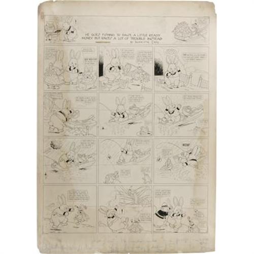 <B>Harrison Cady - Peter Rabbit Sunday Comic Strip Original Art, dated 9-26-20 (NY Tribune, 1920). </B></I> For Peter Rabbit, the fishing game's not what it’s cracked up to be. This strip has an image area of 20" x 26", and aside from some staining to the left side of the Sunday, the art is in Good condition.<BR><BR><b>Shipping:</b> Flat Material, Large (<a target="_blank" href="http://www.heritageauctions.com/common/shipping.php">view shipping information</a>)