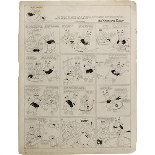 <B>Harrison Cady - Peter Rabbit Sunday Comic Strip Original Art, dated 2-13-21 (NY Tribune, 1921). </B></I> Chaos breaks out when Peter tries to give his family the slip on the skating rink. This strip has an image area of 20" x 26", and aside from some edge and corner wear and a few small stains, the art is in Very Good condition.<BR><BR><b>Shipping:</b> Flat Material, Large (<a target="_blank" href="http://www.heritageauctions.com/common/shipping.php">view shipping information</a>)
