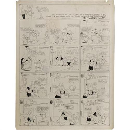 <B>Harrison Cady - Peter Rabbit Sunday Comic Strip Original Art, dated 4-24-21 (NY Tribune, 1921). </B></I> Peter Rabbit falls for a bit of picnic-snatching hi-jinx by Mr. Tumble Bug in this charming Sunday. This strip has an image area of 20" x 26", and the art is in Very Good condition.<BR><BR><b>Shipping:</b> Flat Material, Large (<a target="_blank" href="http://www.heritageauctions.com/common/shipping.php">view shipping information</a>)