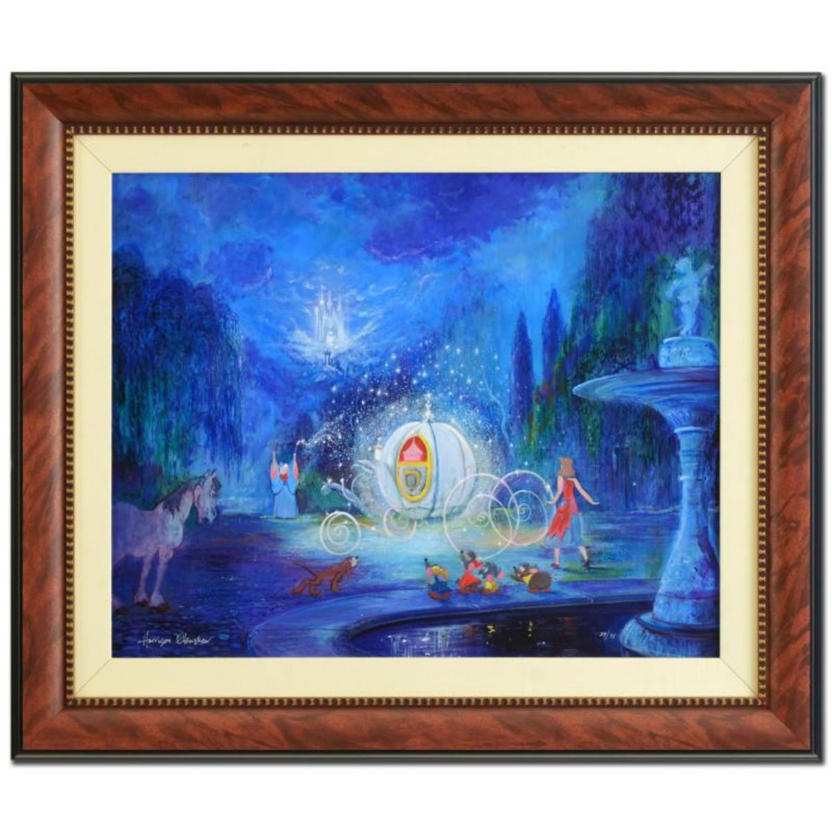 "A Dream is a Wish..." is a framed hand-embellished limited edition giclee on canvas, numbered 29 out of 95 and hand signed by Harrison Ellenshaw. This piece is licensed by Disney Fine Art. Includes Certificate of Authenticity! Measures approx. 39.5" x 33.5" (with frame); 29.5" x 23.5" (image). ** Please note: there is a dent at the lower-left edge of the frame and some chipping to the corners. ** Reference #: 216227