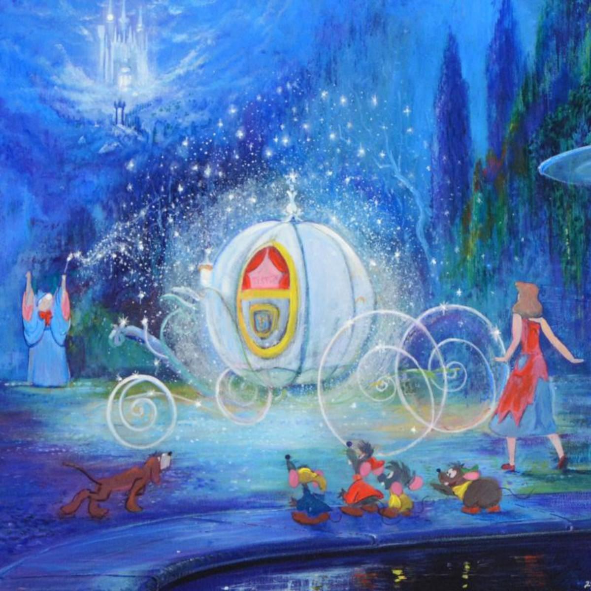 "A Dream is a Wish..." is a framed hand-embellished limited edition giclee on canvas, numbered 29 out of 95 and hand signed by Harrison Ellenshaw. This piece is licensed by Disney Fine Art. Includes Certificate of Authenticity! Measures approx. 39.5" x 33.5" (with frame); 29.5" x 23.5" (image). ** Please note: there is a dent at the lower-left edge of the frame and some chipping to the corners. ** Reference #: 216227