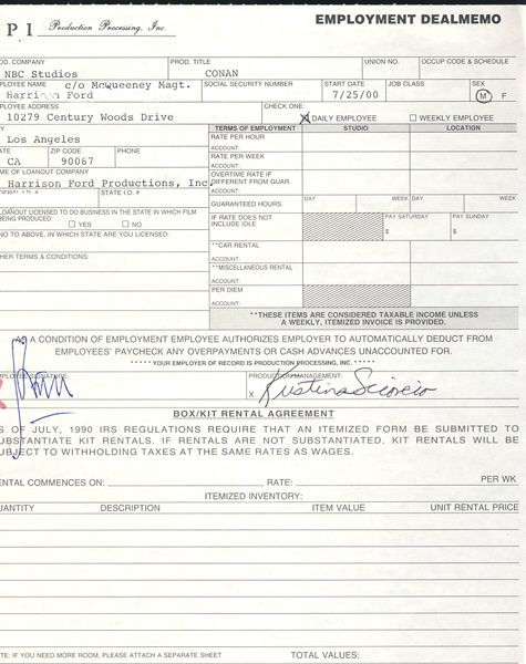Have you ever seen a Harrison Ford contract for sale?  This is a one-page deal memo between NBC and McQueeney Management contracting Harrison Ford for an appearance on "Conan O'Brien".  Signed by both Harrison Ford and Kristina Sciorcio (NBC).