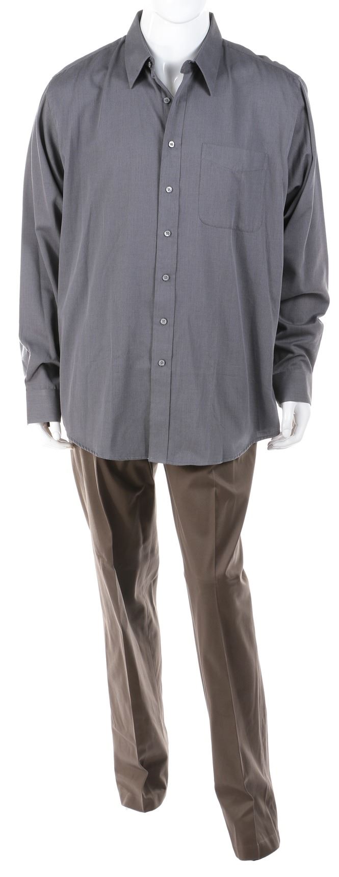 411. Harrison Ford "Max Brogan" ensemble from Crossing Over.(Weinstein Company, 2009) Original (2) piece ensemble including (1) diamond textured slate blue button-up with 1-chest pocket, and (1) pair taupe trousers with zipper front closure. Retaining costumer's oak tag with printed and handwritten production information. In fine condition. $400 - $600