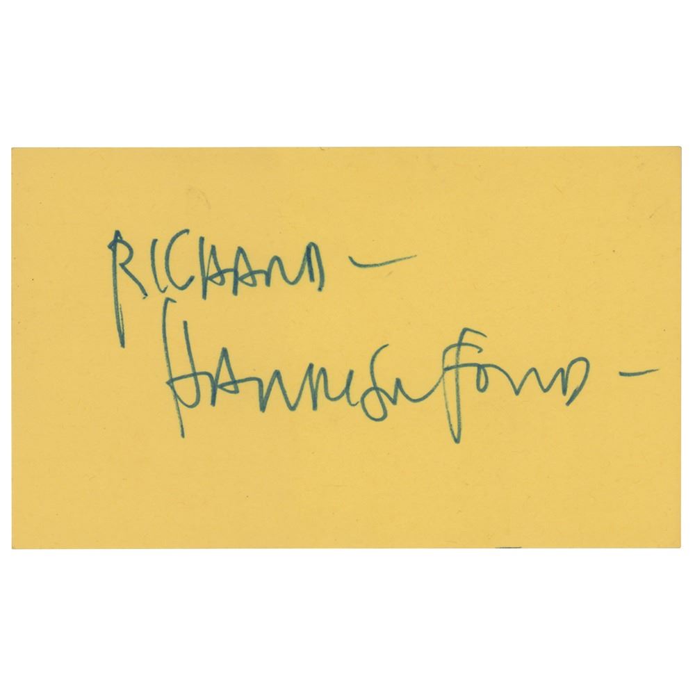 Vintage felt tip signature and inscription, "Richard—Harrison Ford,†on a yellow 5 x 3 card. In very fine condition. An early, legible example of Harrison Ford's sought-after autograph.