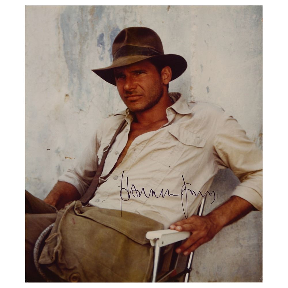 Color glossy 8 x 10 photo of Harrison Ford lounging about as the archeologist and treasure-seeking Indiana Jones, signed in black felt tip. In fine condition, with scattered tiny surface impressions.