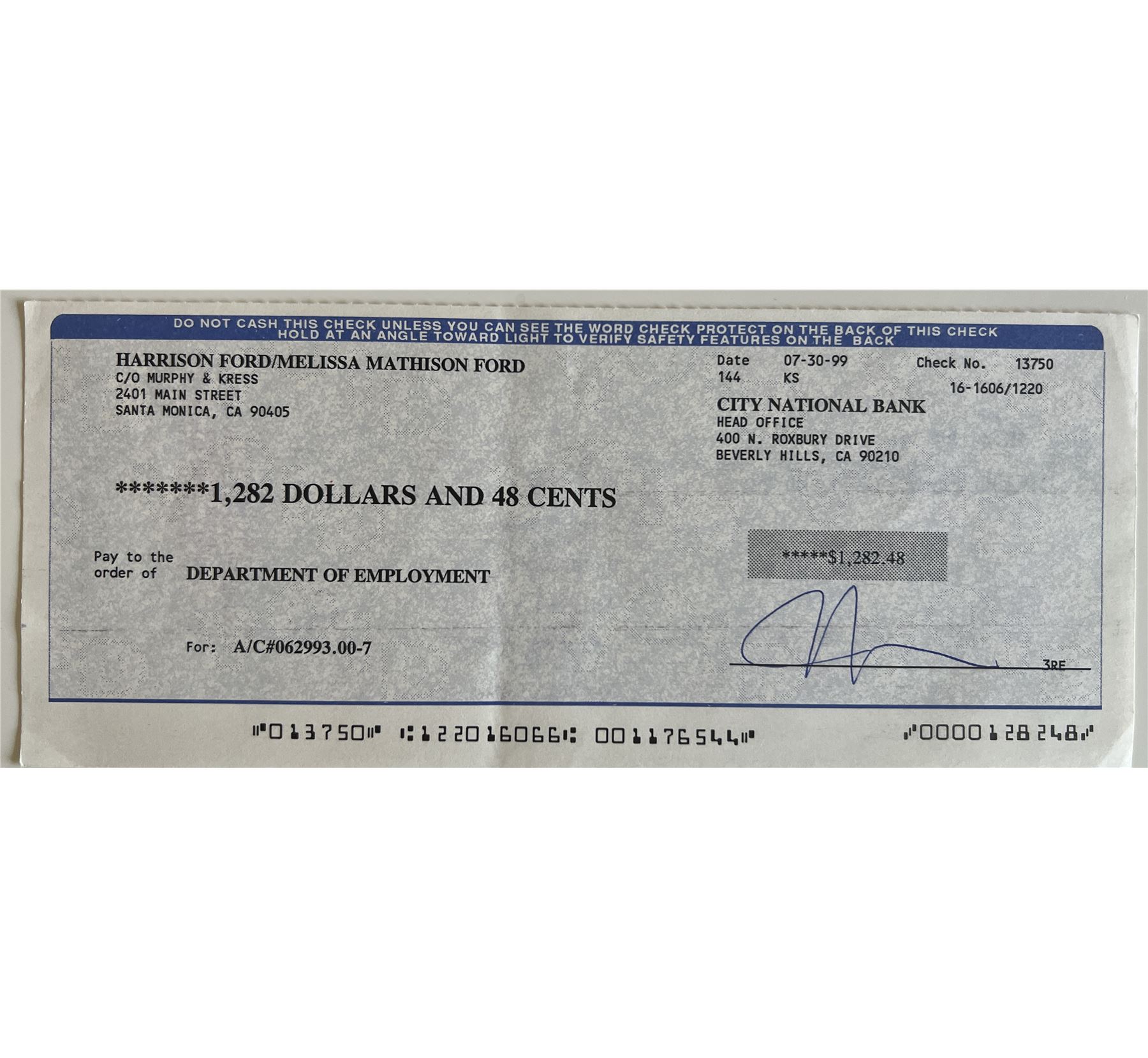Harrison Ford signed check. GFA authenticated. 3x8 inches