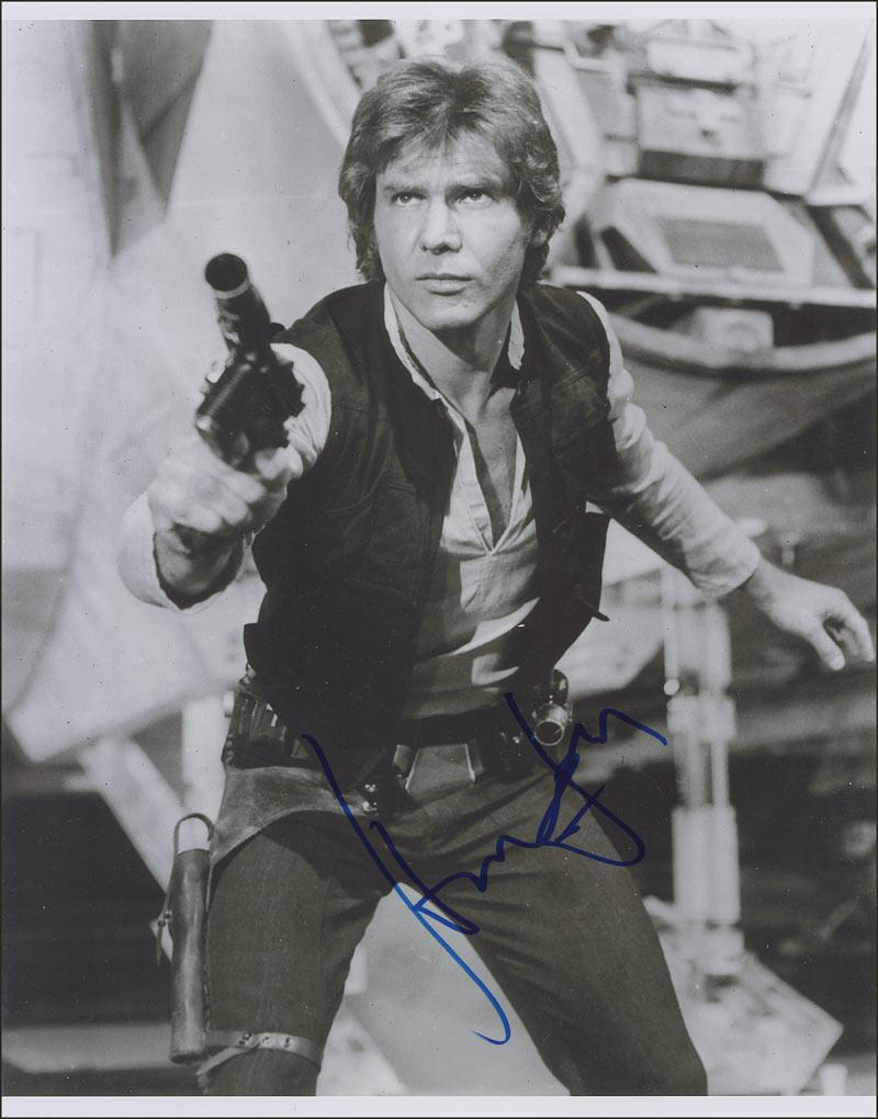 Satin-finish 11 x 14 photo of Han Solo, signed in-person in blue felt tip. In very fine condition.