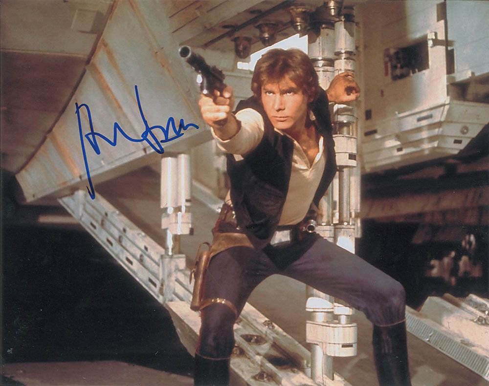 Color satin-finish 14 x 11 photo of Han Solo firing his blaster in front of the Millennium Falcon, signed in person in blue felt tip. In very fine condition.