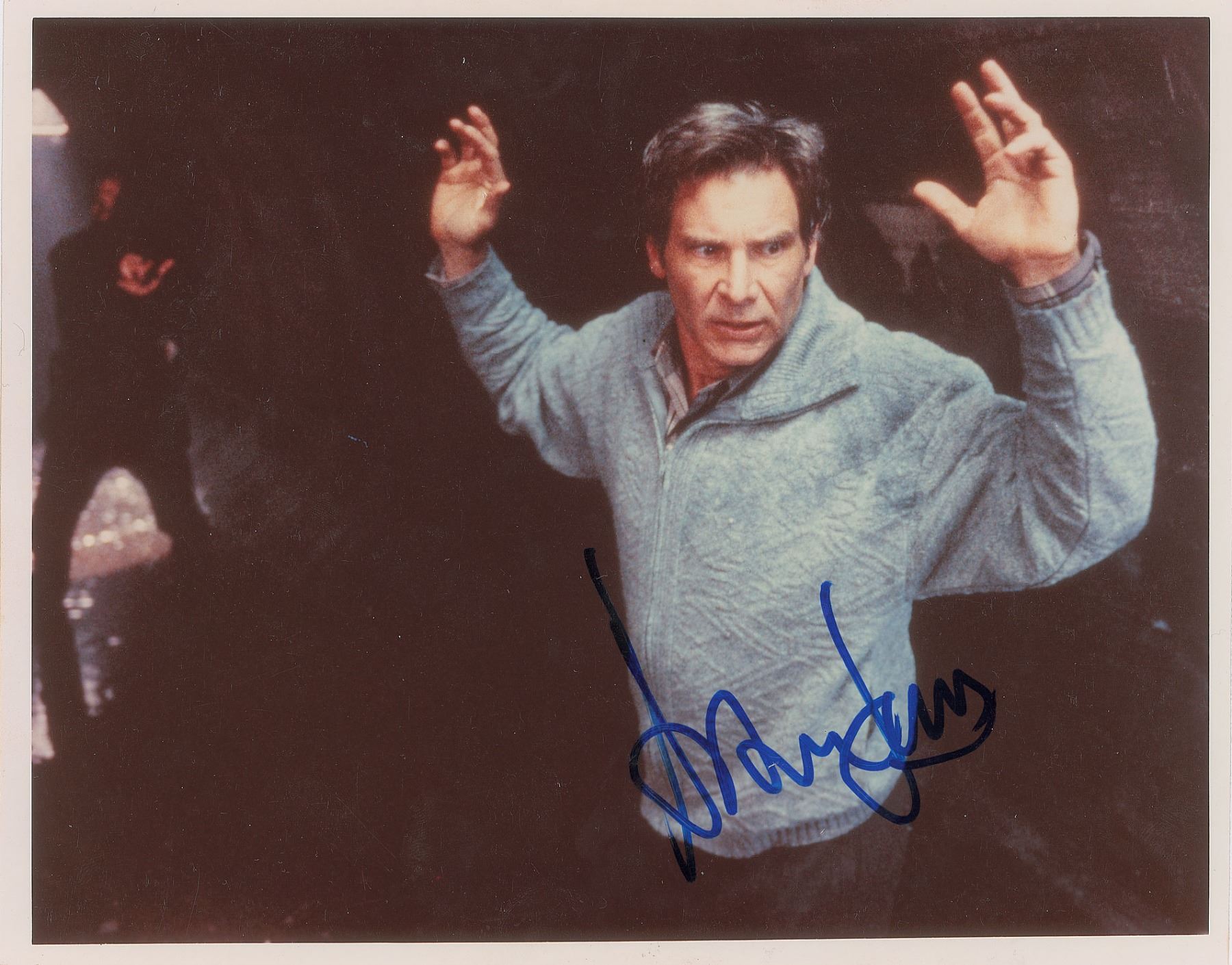 Color glossy 10 x 8 photo of Ford as Dr. Richard Kimble in the 1993 thriller The Fugitive, signed in blue felt tip. In fine condition.