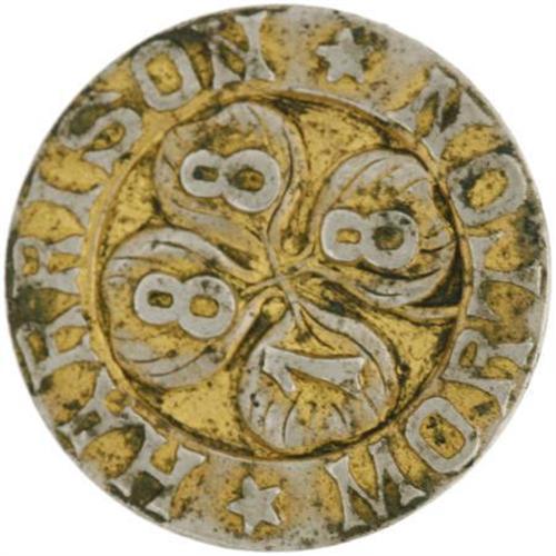 <B>Harrison & Morton Four Leaf Clover Campaign Stud.</B></I> This gilt and steel finish four-leaf clover reads "Harrison * Morton 1888". There is light mildew on the piece, down in the deeper relief areas. Some of the gilt is beginning to wear off slightly. Otherwise still in nice shape. Measures 20mm across. <BR><BR><b>Shipping:</b> Miscellaneous Collectibles, Smal (<a target="_blank" href="http://www.heritageauctions.com/common/shipping.php">view shipping information</a>)