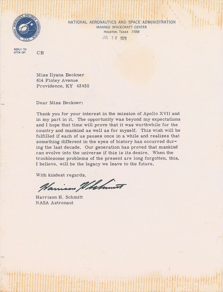 TLS signed “Harrison H. Schmitt,” one page, 8 x 10.5, NASA letterhead, stamp-dated July 16, 1973. Letter to Ilyana Beckner, in full: "Thank you for your interest in the mission of Apollo XVII and in my part in it. The opportunity was beyond my expectations and I hope that time will prove that it was worthwhile for the country and mankind as well as for myself. This wish will be fulfilled if each of us pauses once in a while and realizes that something different in the eyes of history has occurred during the last decade. Our generation has proved that mankind can evolve into the universe if this is its desire. When the troublesome problems of the present are long forgotten, this, I believe, will be the legacy we leave to the future." In very good to fine condition, with toning from previous scrapbook adhesion to top and bottom edges.