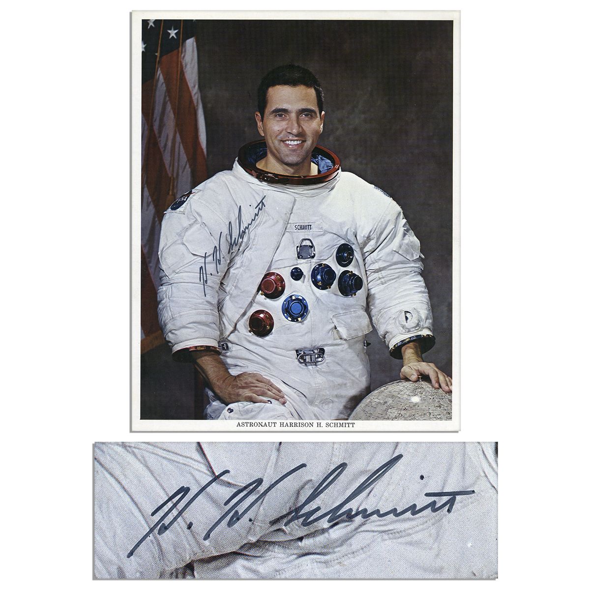 Harrison Schmitt photo signed, ''H. H. Schmitt''. The Apollo 17 astronaut and very last person to step foot on the moon signs his spacesuit in black felt tip across his right arm. NASA publicity photo measures 8'' x 10'', with a semi-matte finish. Near fine.