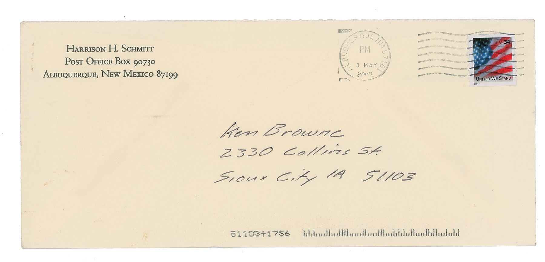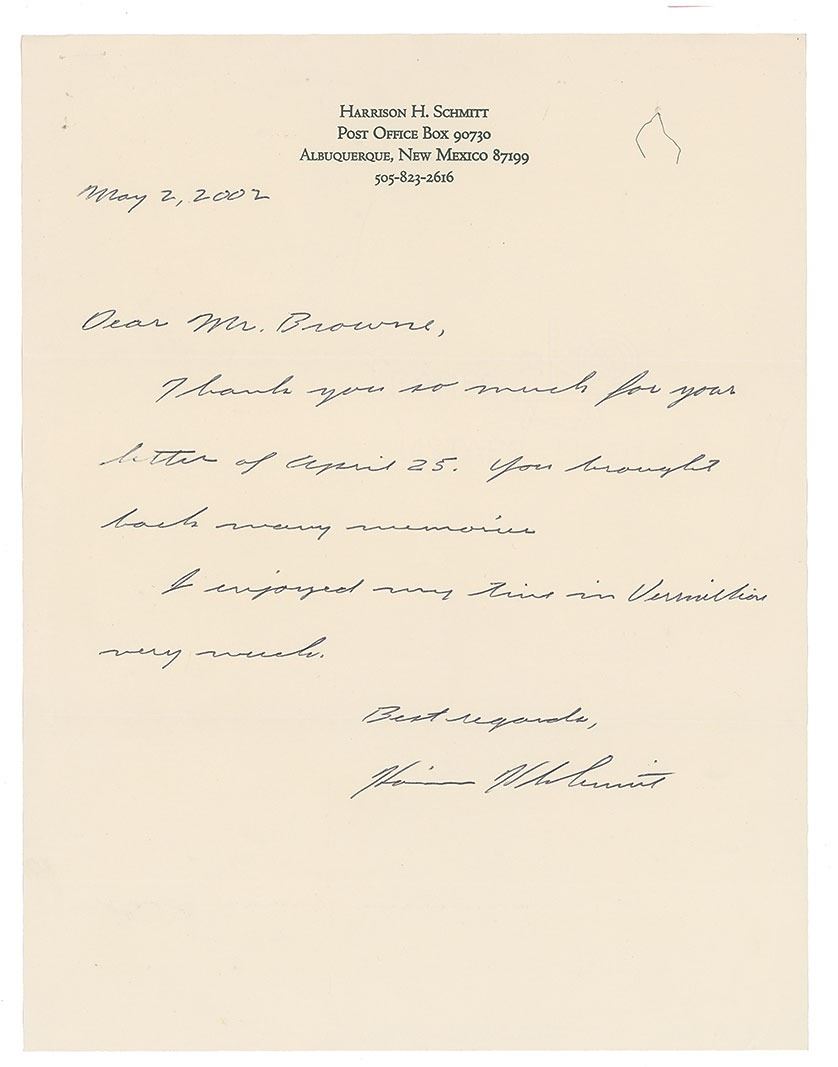 Uncommon ALS signed “Harrison H. Schmitt,” one page, 8.5 x 11, personal letterhead, May 2, 2002. Letter to Ken Browne, in full: "Thank you so much for your letter of April 25. You brought back many memories. I enjoyed my time in Vermillion very much." In very good to fine condition, with general creasing, and staple holes to the upper left corner. Accompanied by the original mailing envelope addressed in Schmitt's hand, and a typed note from the recipient: "Dr. Schmitt came to Vermillion, South Dakota (University of South Dakota)—to address students, April 2002—Wrote to tell him of our interest in his career."