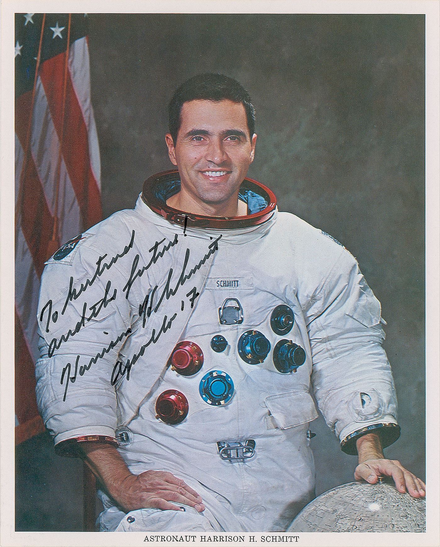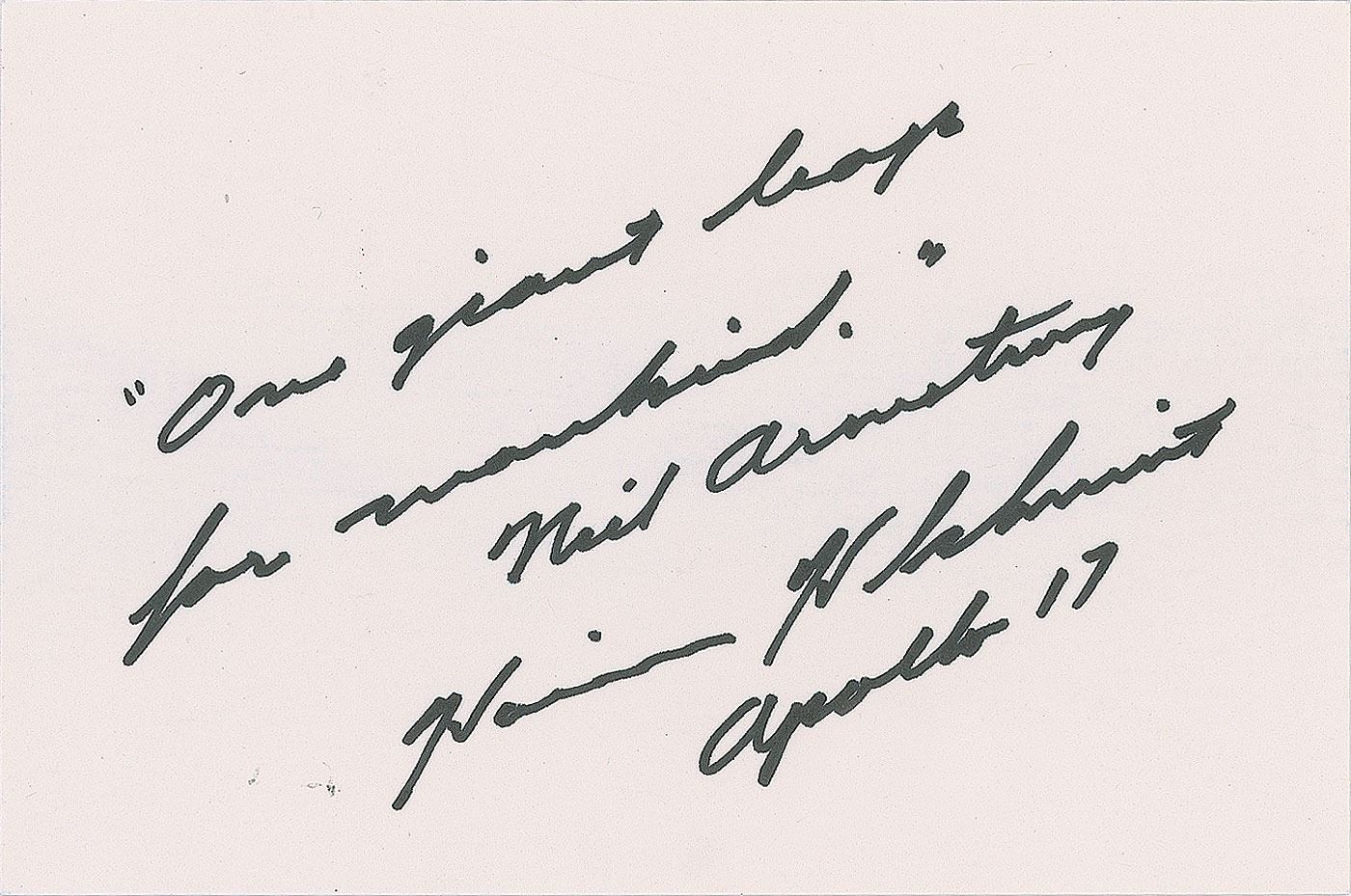 Two items: an AQS on an off-white 6 x 4 card, signed in black felt tip, "Harrison H. Schmitt, Apollo 17," who quotes history's first moonwalker, in full: "'One giant leap for mankind.' Neil Armstrong"; and an official color 8 x 10 NASA lithograph of Schmitt wearing his white space suit and holding a lunar globe, signed and inscribed in black felt tip, "To Gertrude and the future! Harrison H. Schmitt, Apollo 17." In overall fine condition, with light creasing to the photo, primarily along the top edge.