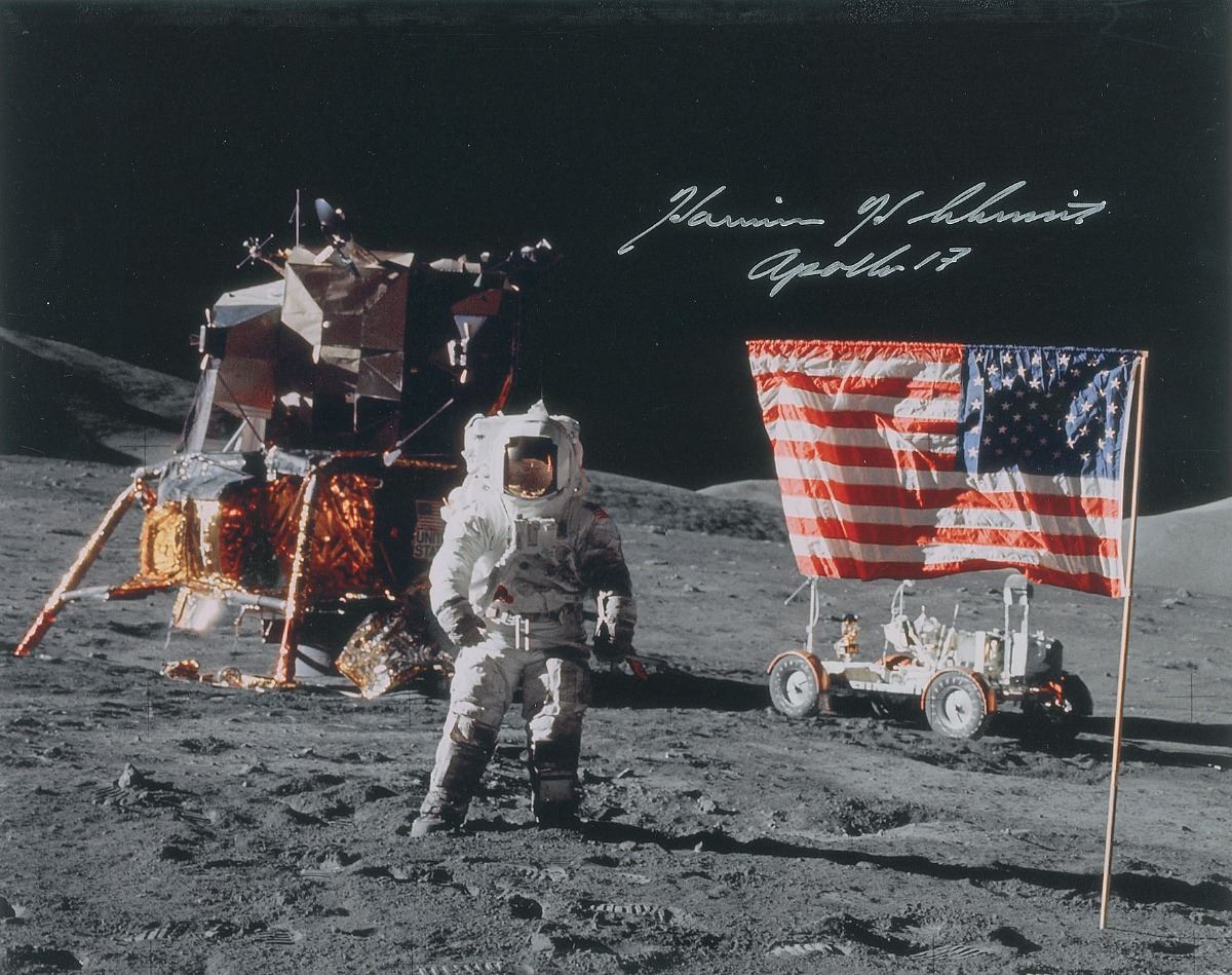 Color satin-finish 10 x 8 photo of Schmitt on the lunar surface, signed in silver ink, “Harrison H. Schmitt, Apollo 17.” In fine condition.