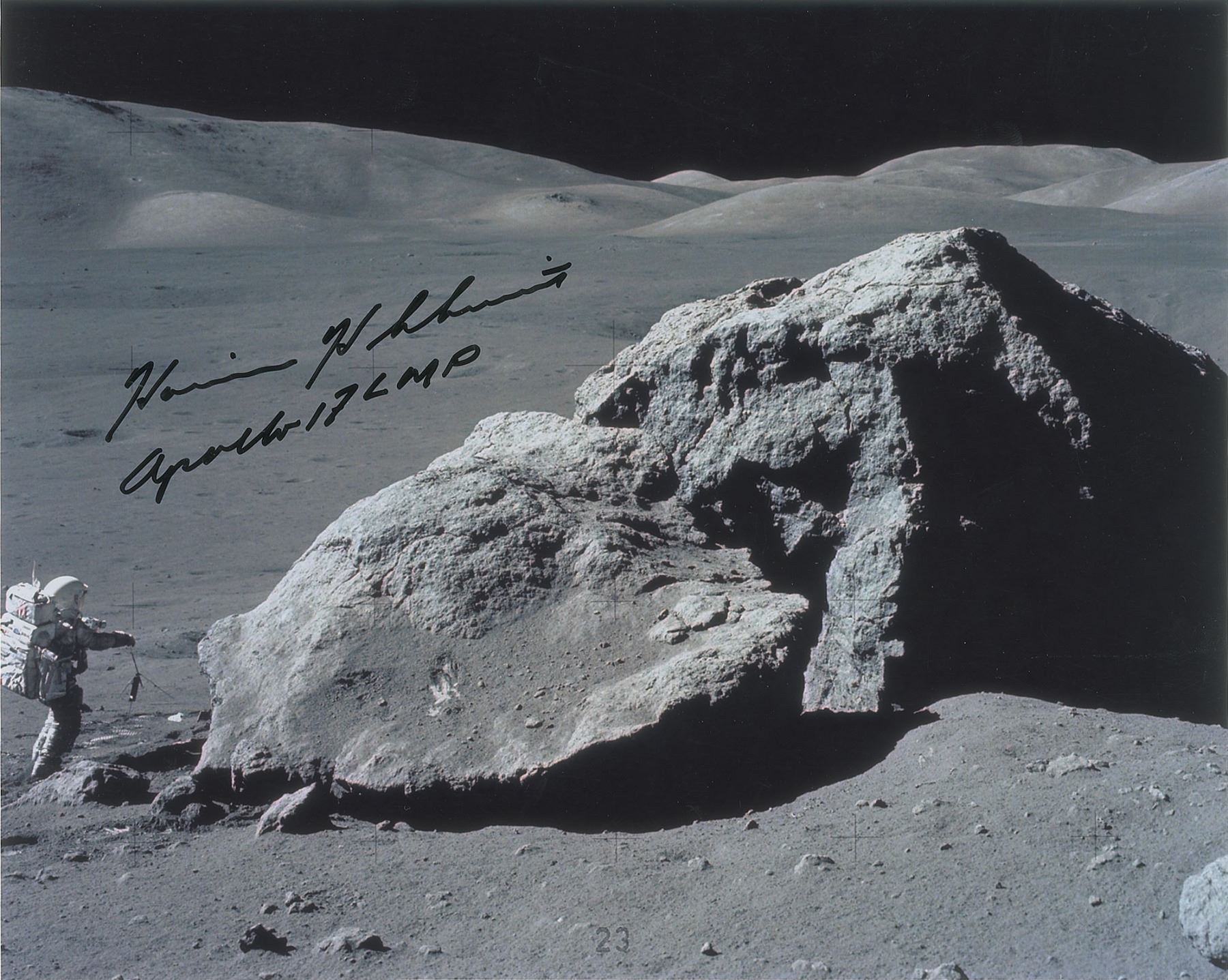 Choice color glossy 10 x 8 photo of Schmitt standing beside a large boulder on the lunar surface during an Apollo 17 EVA, signed in black felt tip, "Harrison H. Schmitt, Apollo 17 LMP." In very fine condition. The consignor notes that this was signed at Schmitt's last Novaspace signing, and that he no longer signs anything but his book.