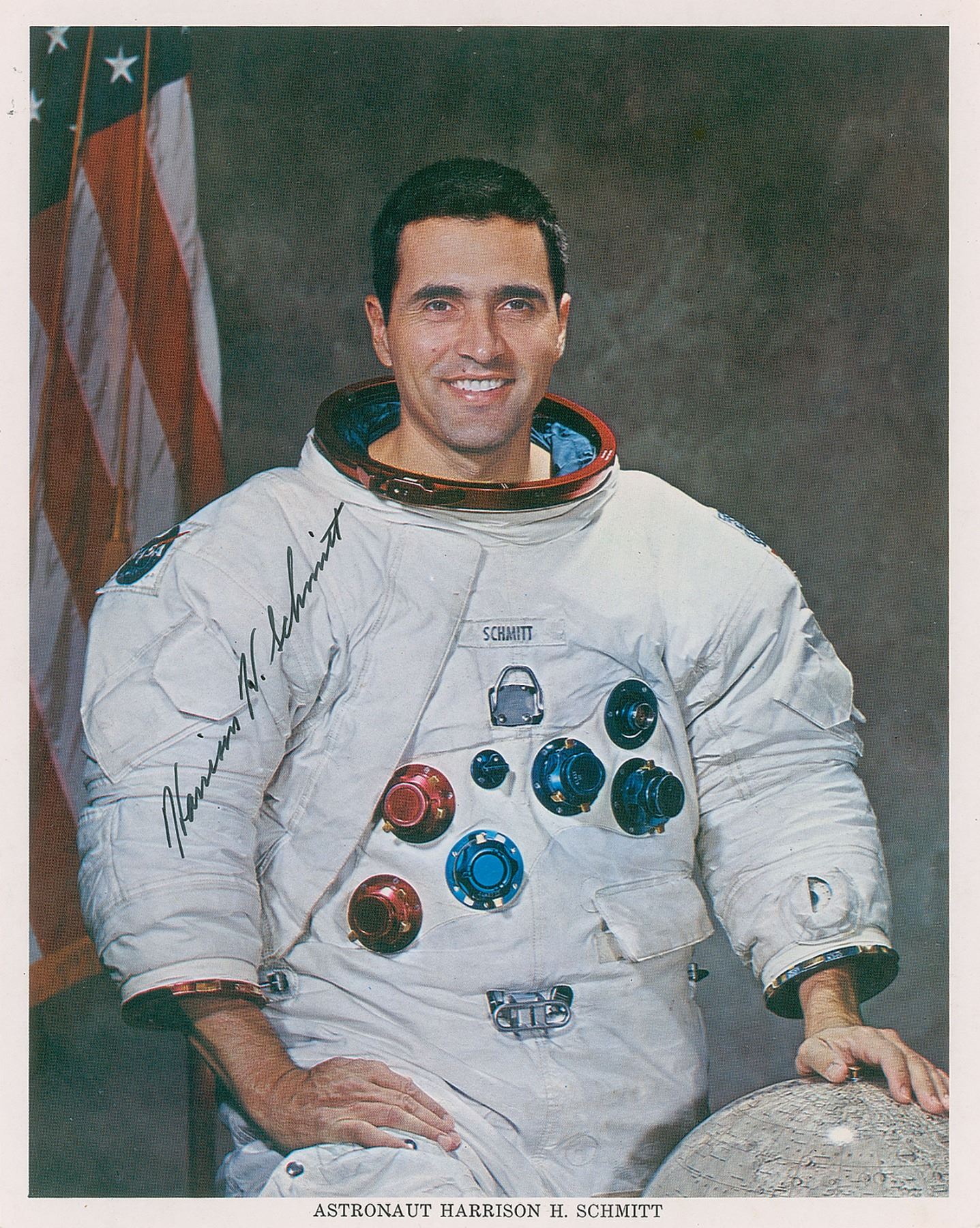 Official color 8 x 10 NASA lithograph of Schmitt posing in his white space suit with a lunar globe, neatly signed in black felt tip, "Harrison H. Schmitt." In very fine condition.