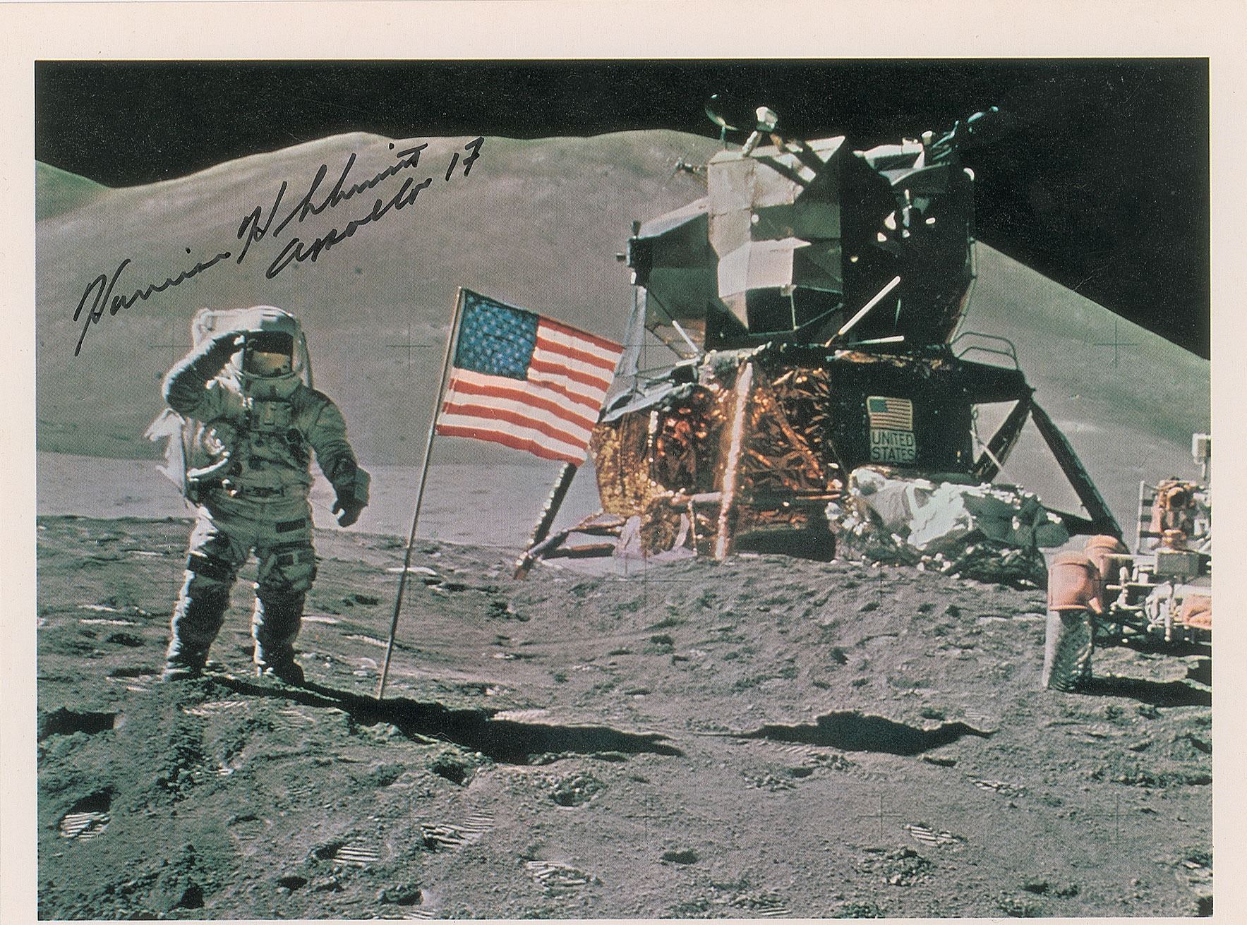 Unusual color 10.5 x 8 lithograph of Apollo 15 LMP Jim Irwin saluting the American flag on the lunar surface, signed in black felt tip by the Apollo 17 LMP, "Harrison H. Schmitt, Apollo 17." In fine condition.