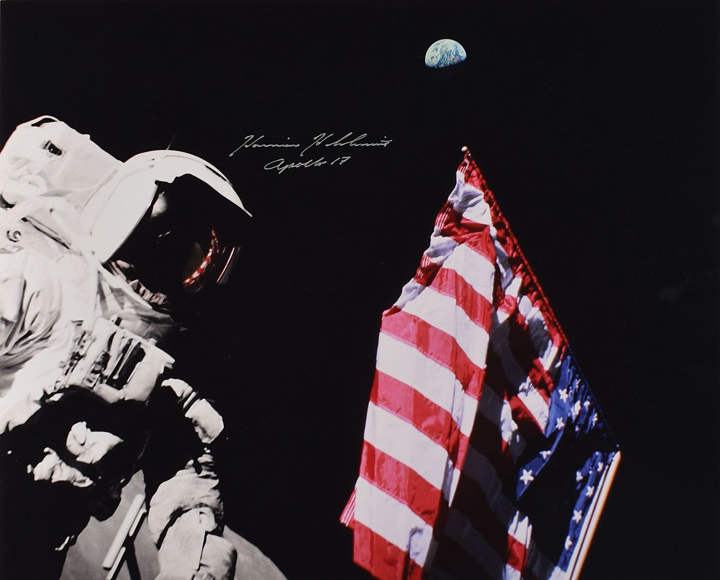 Wonderful color satin-finish 20 x 16 photo of Lunar Module Pilot Harrison Schmitt posing next to the American flag during an Apollo 17 EVA, with the Earth seen glowing in the background, signed in silver ink, "Harrison H. Schmitt, Apollo 17." In fine condition. Accompanied by a certificate of authenticity from Novaspace.