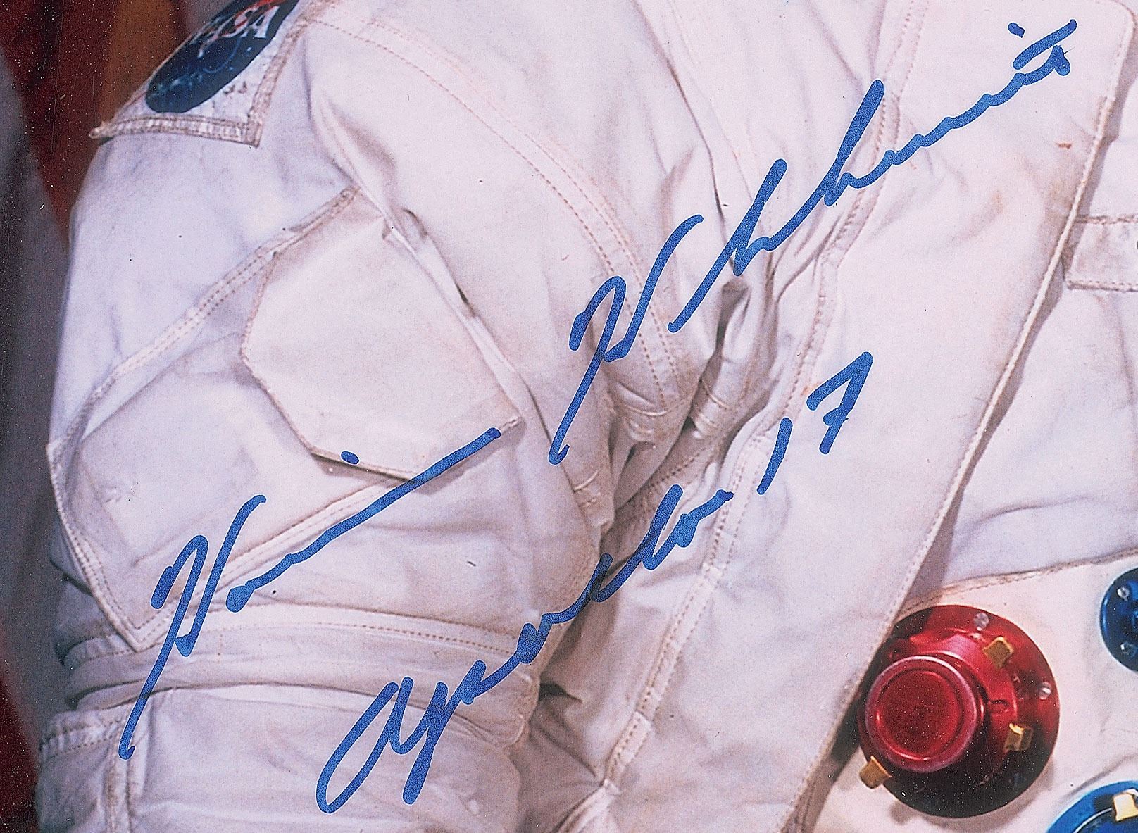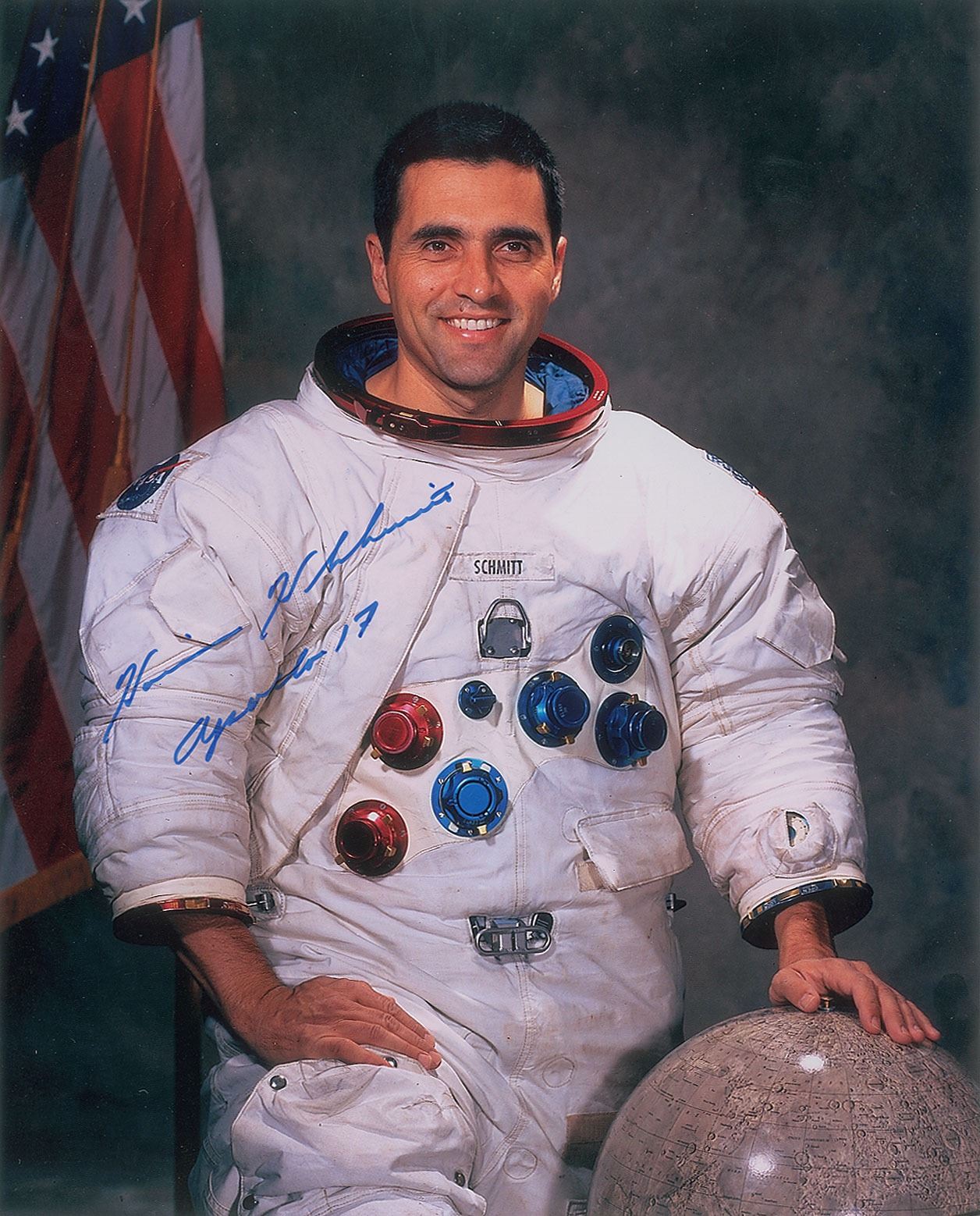 Color satin-finish 8 x 10 photo of Harrison Schmitt posing in his white space suit with a lunar globe, signed in blue felt tip, "Harrison H. Schmitt, Apollo 17." In fine condition, with three slight binder dings to the left edge. Accompanied by a certificate of authenticity from Novaspace.