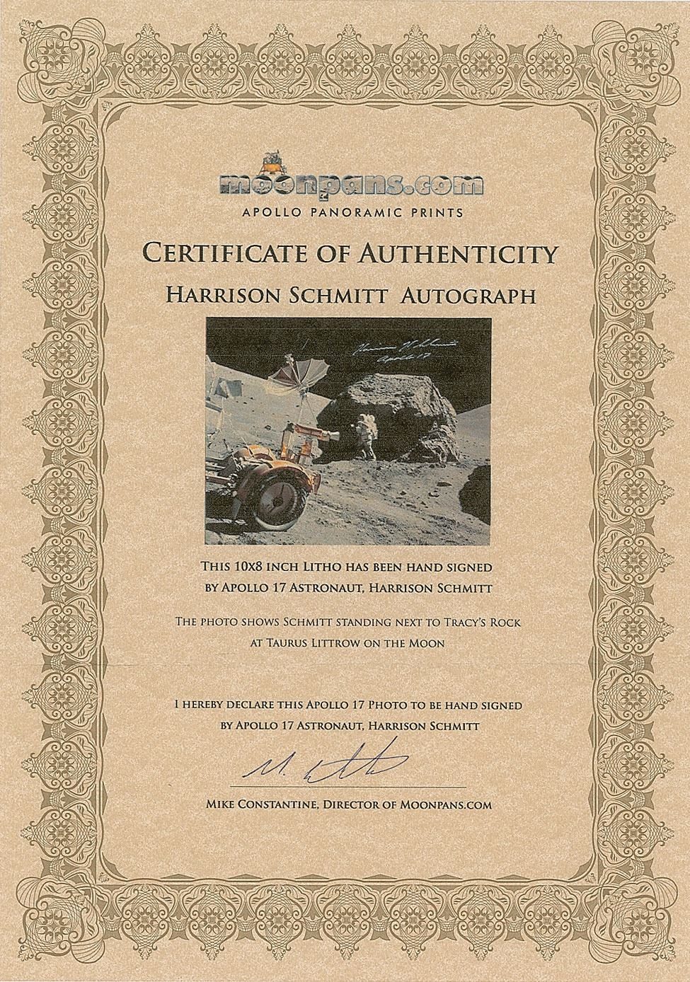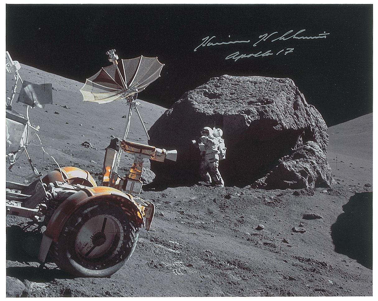 Color satin-finish 10 x 8 full-length photo of LMP Schmitt standing next to Tracy's Rock at Taurus Littrow during an Apollo 17 EVA, signed in silver ink, "Harrison H. Schmitt, Apollo 17." In fine condition. Accompanied by a certificate of authenticity from Moonpans.