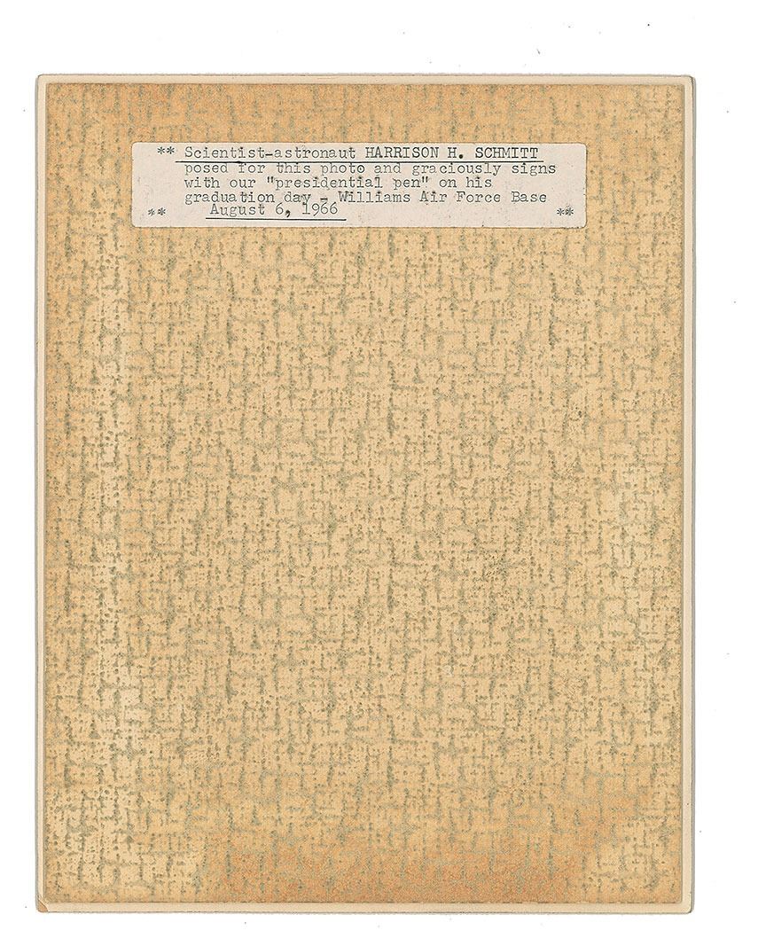 Vintage glossy 4.5 x 6.5 photo of Schmitt on his graduation day from jet pilot training at Williams Air Force Base, displayed in a 7.25 x 9.25 mat, signed on the mat in black ink, "Harrison H. Schmitt." The reverse bears a typed collector's label: "Scientist-astronaut Harrison H. Schmitt posed for this photo and graciously signs with our 'presidential pen' on his graduation day - Williams Air Force Base, August 6, 1966." In fine condition. A geologist by education, Schmitt was selected as a member of the first group of scientist-astronauts in June 1965, and then spent his first year at Williams Air Force Base to train as a jet pilot. He graduated from the flight training course on the date of this signature—a most historic, early piece.