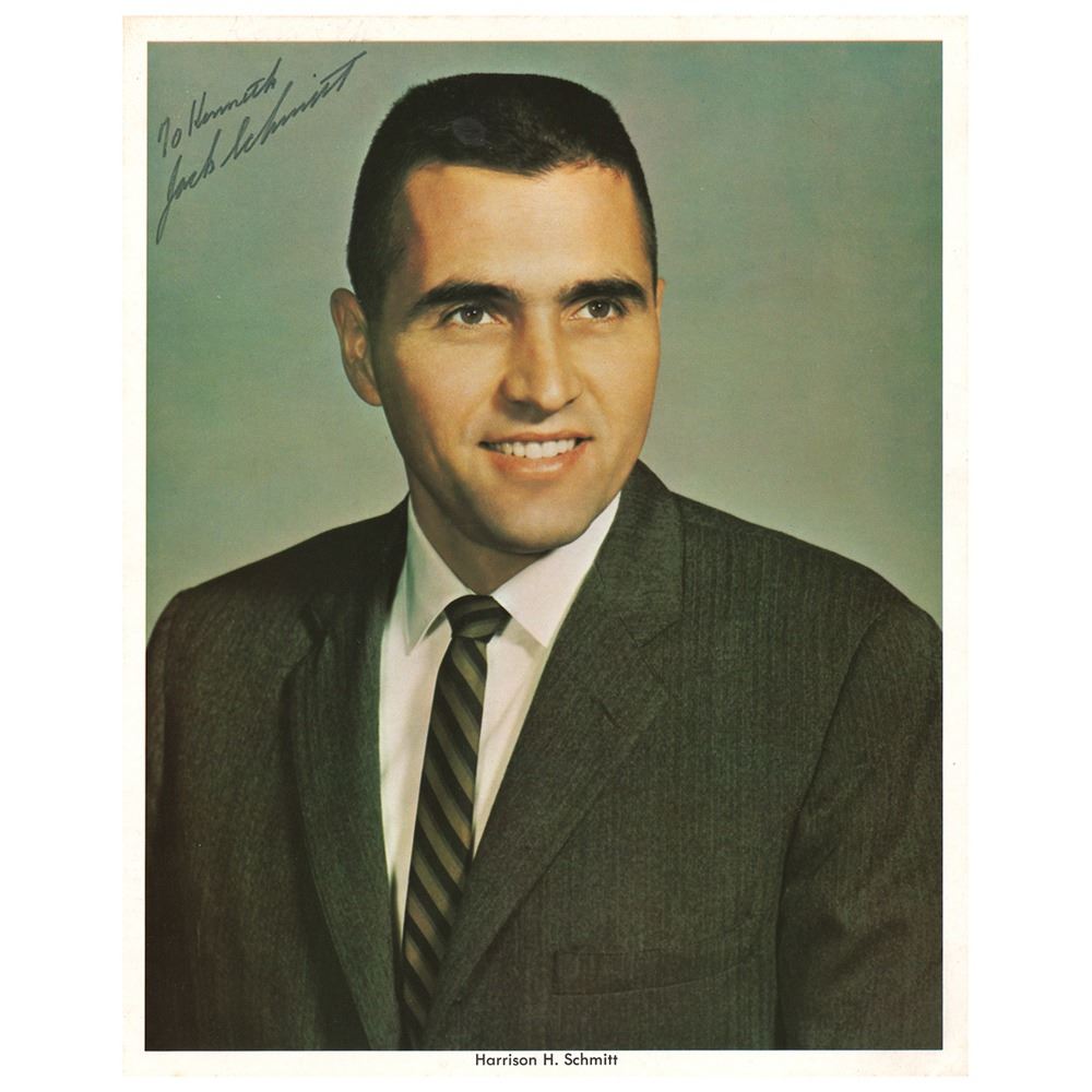 Official color 8 x 10 NASA lithograph of Apollo 17 moonwalker Harrison Schmitt in a formal pose, signed and inscribed in black felt tip, "To Kenneth, Jack Schmitt." In fine condition, with a few small surface creases, and a few small stains, one touching Schmitt's hair, and another, his nose.