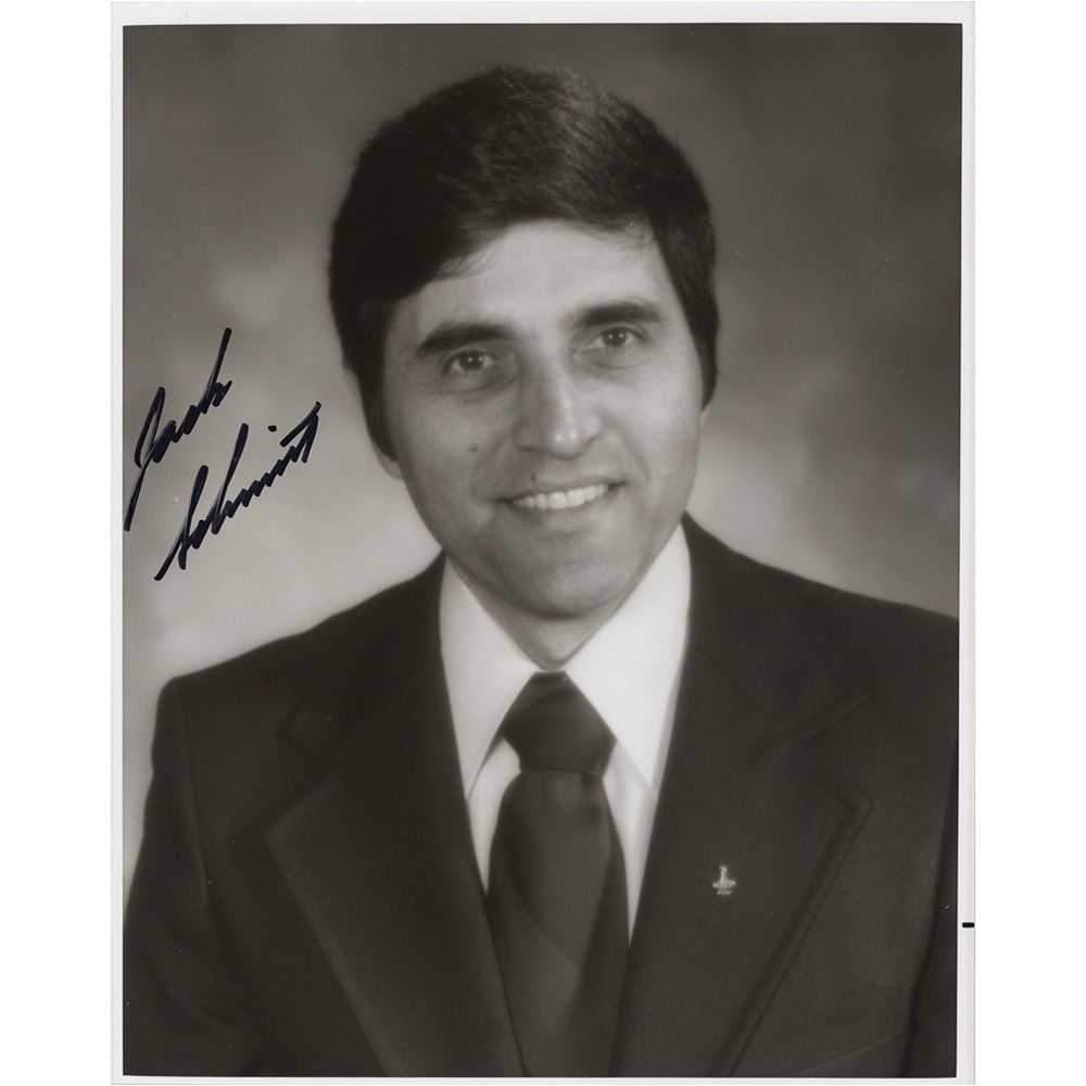Glossy 8 x 10 photo of Apollo 17 moonwalker Harrison Schmitt in a formal pose, his lapel bearing an astronaut pin, signed in black felt tip, "Jack Schmitt." In fine condition, with a few faint bends.
