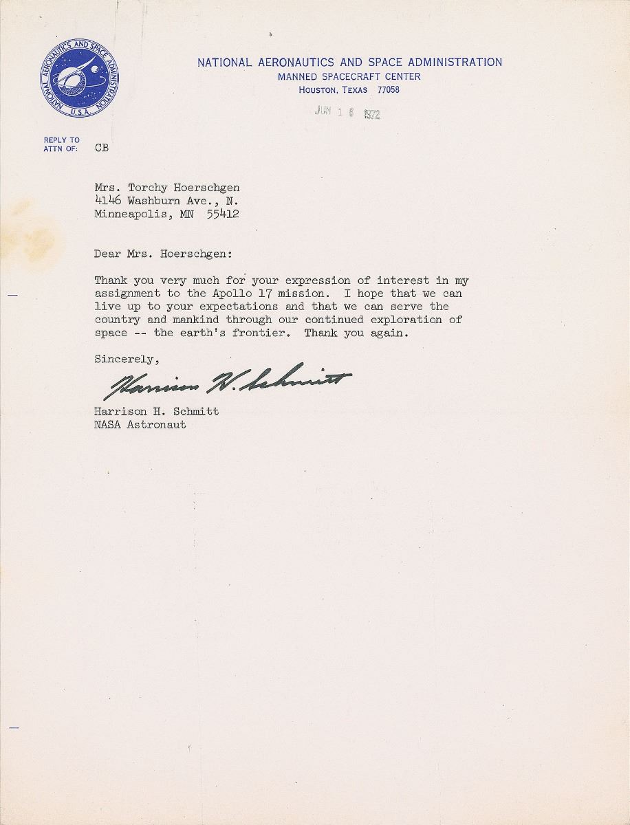 TLS signed “Harrison H. Schmitt,” one page, 8 x 10.5, National Aeronautics and Space Administration letterhead, no date, but postmarked June 16, 1972. Letter to Torchy Hoerschgen, in full: “Thank you very much for your expression of interest in my assignment to the Apollo 17 mission. I hope that we can live up to your expectations and that we can serve the country and mankind through our continued exploration of space—the earth’s frontier. Thank you again.” In fine condition, with a light paperclip impression to top edge, and small stain to left edge. Six months later on December 11, 1972, Schmitt would become the twelfth person to set foot on the moon.