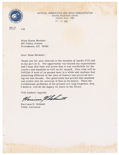 TLS signed “Harrison H. Schmitt,” one page, 8 x 10.5, NASA letterhead, July 16, 1973. Letter of thanks to a supporter. In full: “Thank you for your interest in the mission of Apollo XVII and in my part in it. The opportunity was beyond my expectations and I hope that time will prove that it was worthwhile for the country and mankind as well as for myself. This wish will be fulfilled if each of us pauses once in a while and realizes that something different in the eyes of history has occurred during the last decade. Our generation has proved that mankind can evolve into the universe if this is its desire. When the troublesome problems of the present are long forgotten, this, I believe, will be the legacy we leave to the future.” Toning and vertical lines from magnetic album at top and bottom edges, otherwise fine condition. A modest letter from one of the last men to walk on the moon.