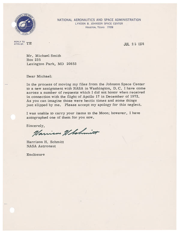 TLS signed “Harrison H. Schmitt,” one page, 8 x 10.5, NASA letterhead, stamp dated July 25, 1974. Letter to a space enthusiast. In part: “I have come across a number of requests which I did not honor when received in connection with the flight of Apollo 17…I was unable to carry your items to the Moon.” In fine condition.