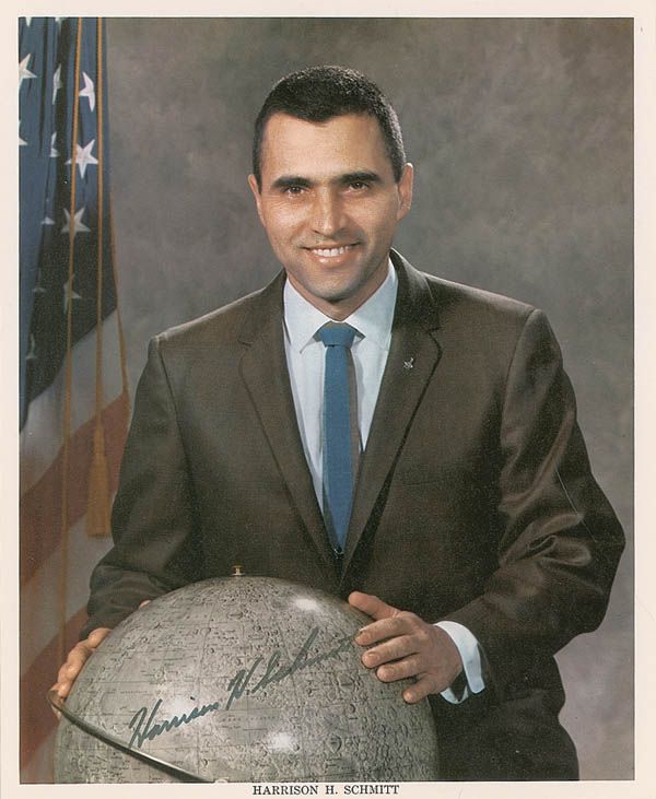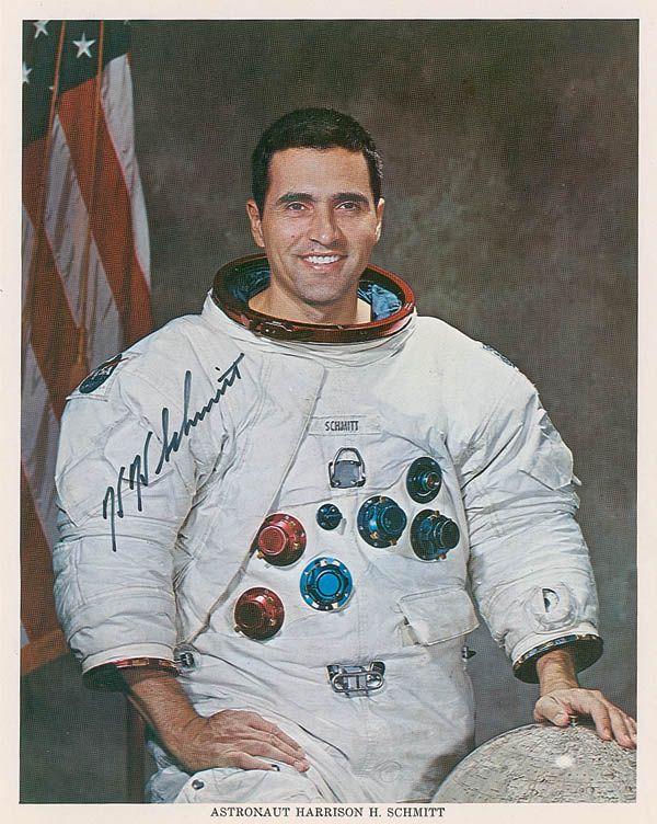 Two color 8 x 10 NASA photos, one of Schmitt in his space suit, signed in black felt tip, “H. H. Schmitt,” and one of Schmitt in a jacket and tie, signed in black felt tip “Harrison H. Schmitt.” In fine condition.