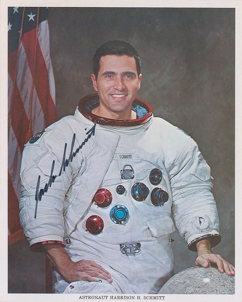 Color 8 x 10 NASA photo of Schmitt in his white spacesuit, signed in black felt tip, “Jack Schmitt.” In fine condition.