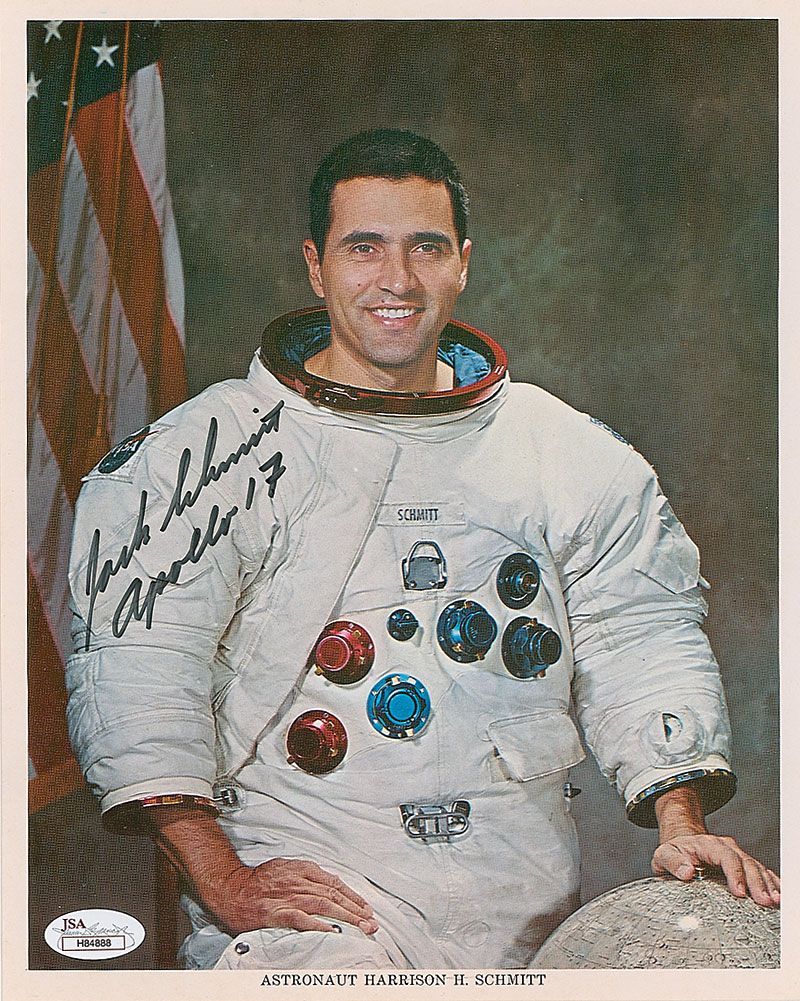 Color 8 x 10 NASA photo of Schmitt in his space suit, signed in black felt tip, “Jack Schmitt, Apollo 17.” In fine condition, with a James Spence authentication label affixed to lower corner. Accompanied by a certificate of authenticity from James Spence.