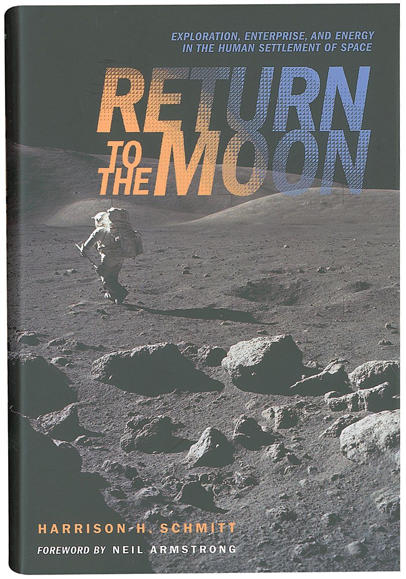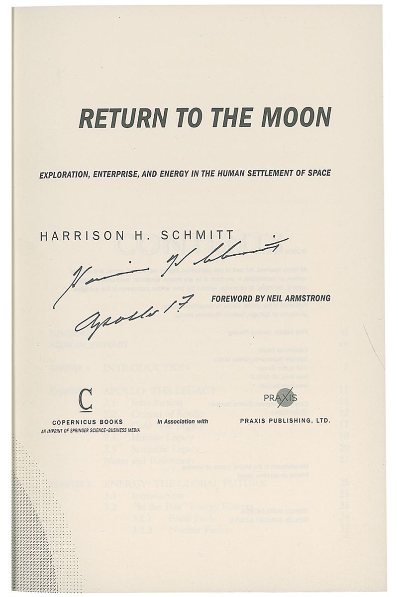 Signed book: Return to the Moon. First edition, later printing. NY: Copernicus Books, 2006. Hardcover with dust jacket, 6.5 x 9.5, 335 pages. Signed on the title page in black felt tip, “Harrison H. Schmitt, Apollo 17.” In very fine condition.