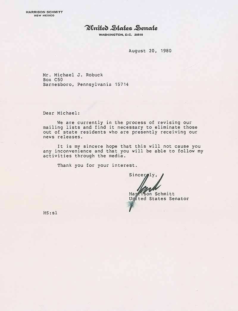 TLS signed “Jack,” one page, 8.25 x 11, United States Senate letterhead, August 20, 1980. Letter to a political supporter. In part: “We are currently in the process of revising our mailing lists and find it necessary to eliminate those out of state residents who are presently receiving our news releases.” In fine condition, with a brush to the bottom of the “J” in the signature. Accompanied by the original mailing envelope.