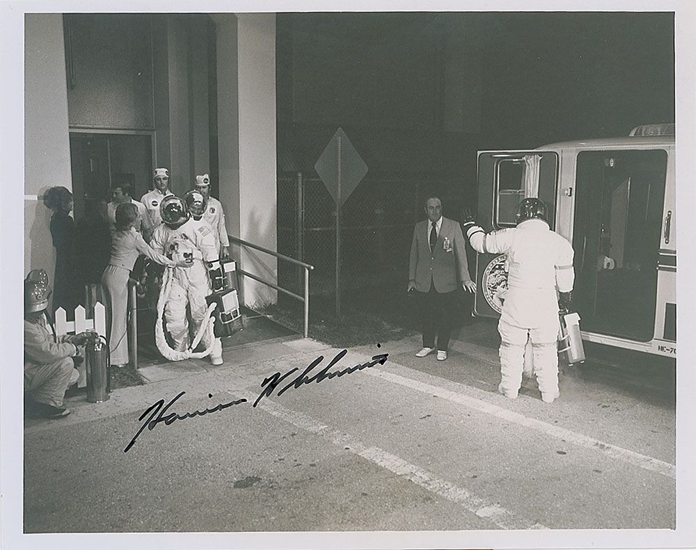 Official satin-finish 10 x 8 NASA photo of the Apollo 17 crew loading into the van for their ride to the launch pad, signed in black felt tip, “Harrison H. Schmitt.” In fine condition.