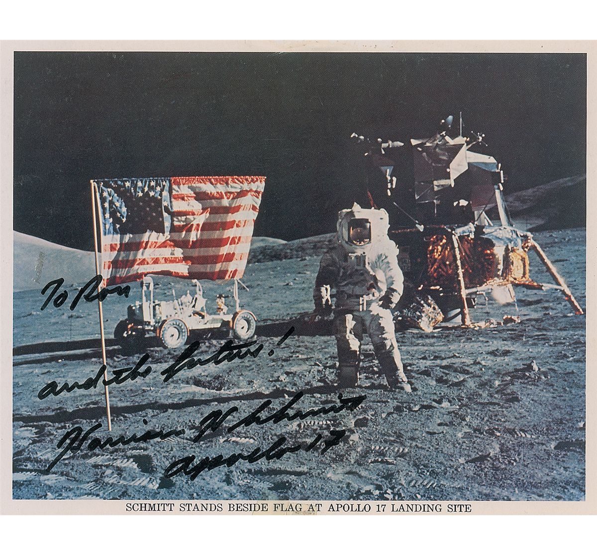 Official color 10 x 8 NASA lithograph of Schmitt on the lunar surface, signed and inscribed in black felt tip, “To Ron and the future! Harrison H. Schmitt, Apollo 17.” In very good condition, with a small area of adhesive remnants above the inscription, tape remnants to bottom edge and reverse, and slight surface loss to top edge.