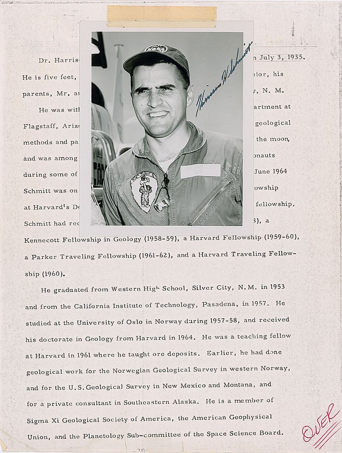 Vintage glossy 4 x 5 photo of Schmitt wearing a training suit and NASA cap, signed in fountain pen, "Harrison H. Schmitt." The photo is affixed to a biographical sheet for Schmitt, with reverse bearing a typed notation indicating that the photo was signed following Schmitt's graduation at Williams Air Force Base on August 6, 1966. In very good to fine condition, with old tape along the top edge of the photo.