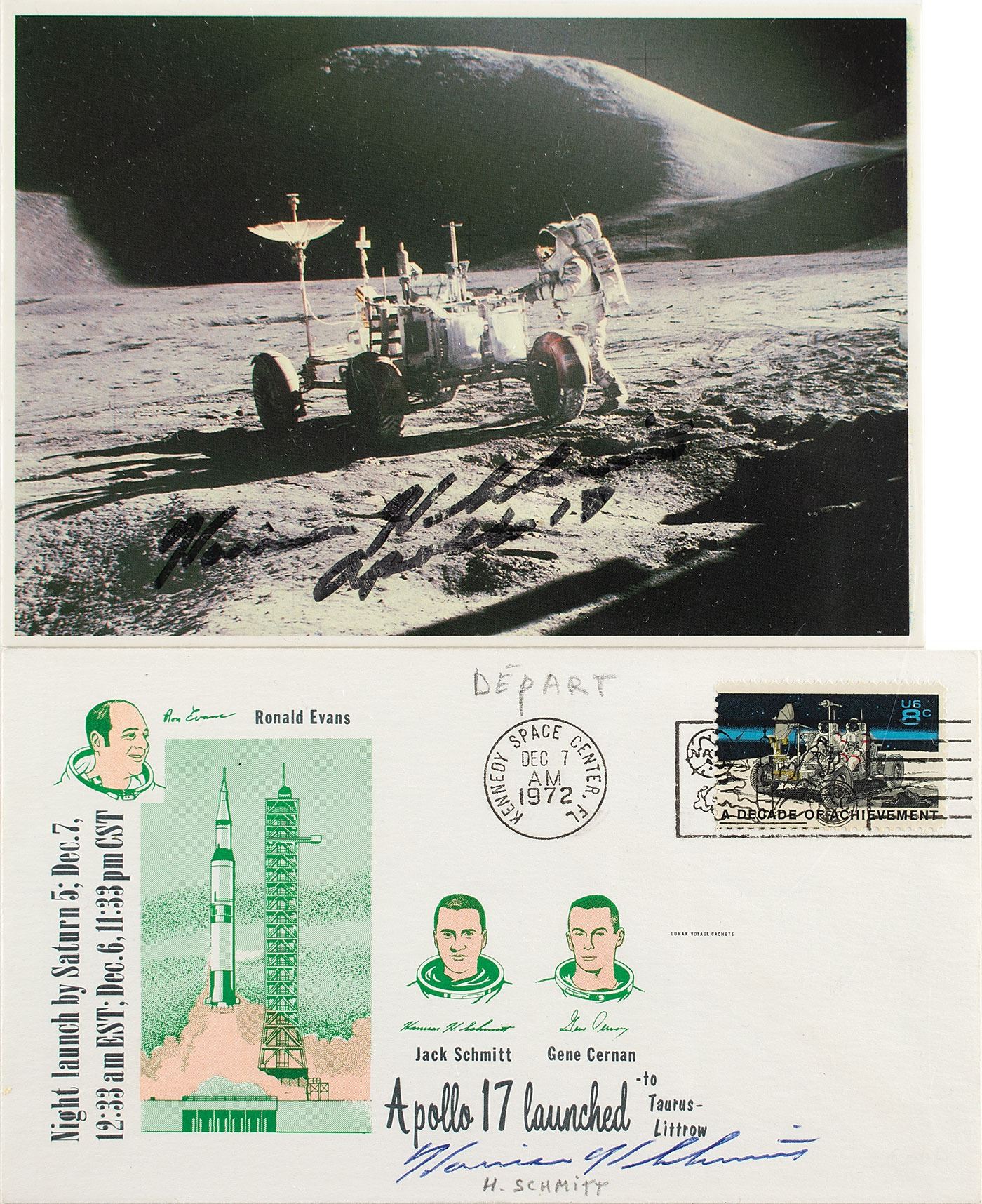 Two items: a commemorative cover with a color cachet honoring the night launch of the Apollo 17 mission, postmarked at the Kennedy Space Center on December 7, 1972, signed in blue ballpoint, "Harrison H. Schmitt"; and a color glossy 6 x 4.25 postcard photo of an Apollo 15 EVA with the lunar rover, signed in black felt tip, "Harrison H. Schmitt, Apollo 17." In overall fine condition, with light scuffing to the signature on the photo.