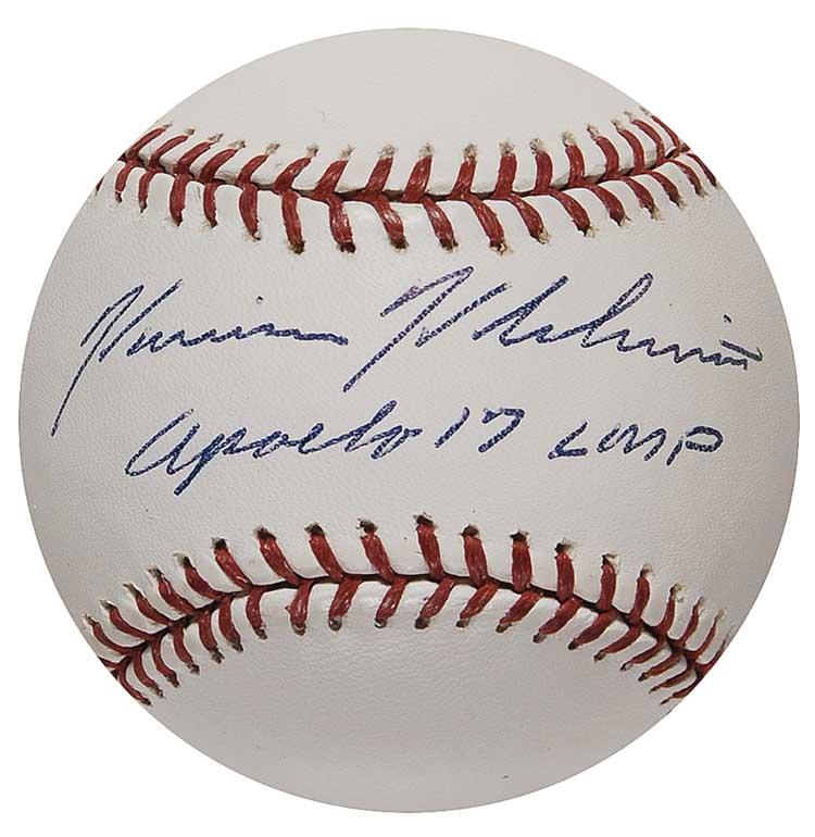 Official Rawlings Major League baseball signed in blue ballpoint on the sweet spot, “Harrison Schmitt Apollo 17 LMP.” In very fine condition. Pre-certified Scott Cornish and RRAuction COA.