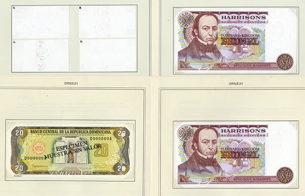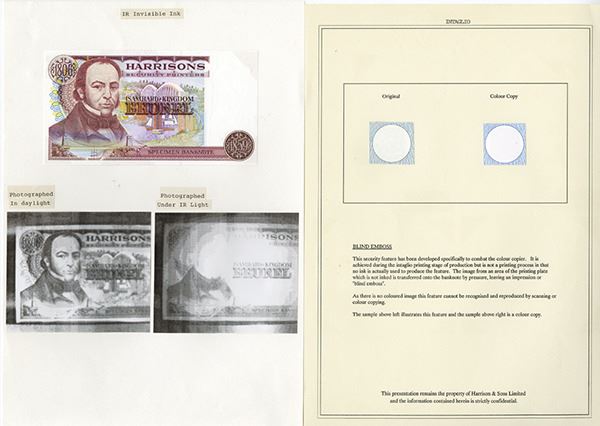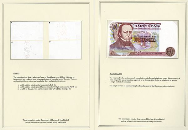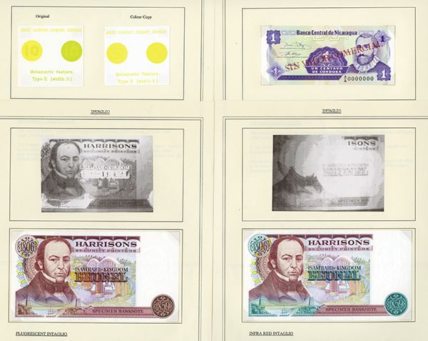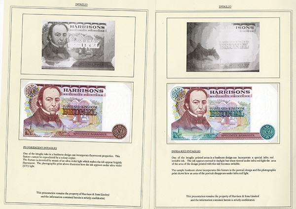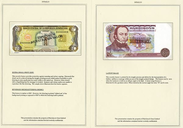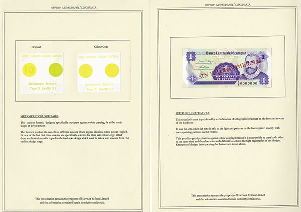 England. Leather bound 3 ring binder with over 30 pages of various counterfeit protection devices used on banknotes. Includes a specimen Nicaragua note and numerous Harrisons ad notes with different security devices. Rare and interesting counterfeit protection book. H&S