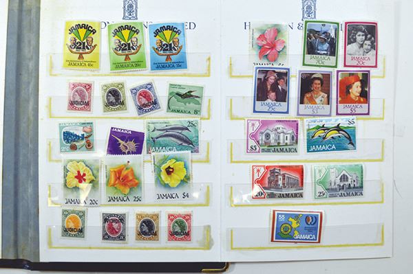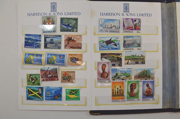 Great Britain. Plush blue binder with four pages of Jamaican Mint Stamps denominated in either pence/pounds or cents. Includes some with Judicial overprints. The glues to hold the acetate was not the best and now has loosened on many lines, or stained the bottoms of some of the stamps. Includes 53 stamps.